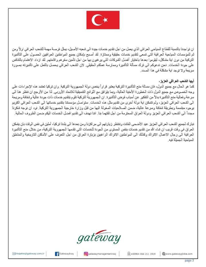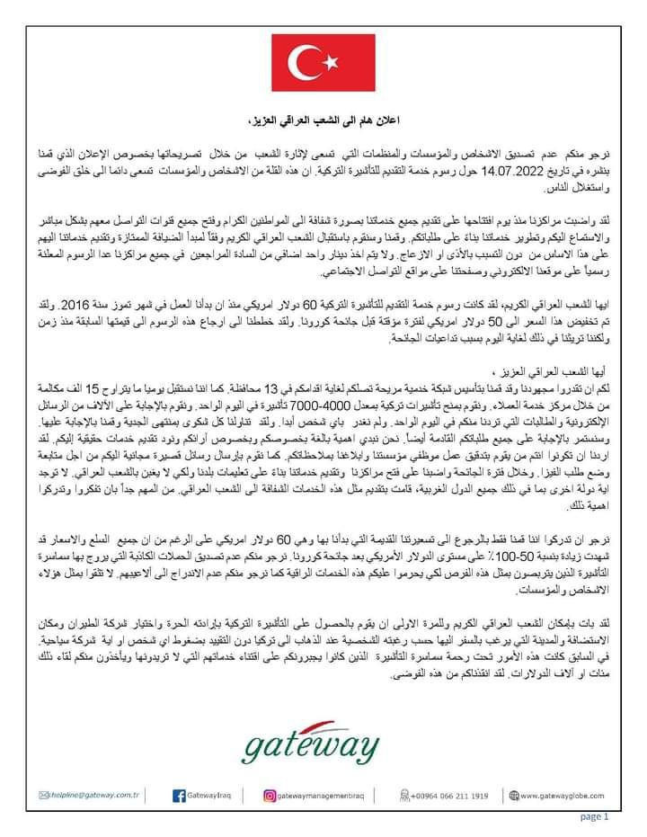 أصدر مركز تقديم طلبات التأشيرة التركية في العراق، اليوم السبت، توضيحاً بخصوص رفع سعر التأشيرة من 50 إلى 60 دولاراً.
