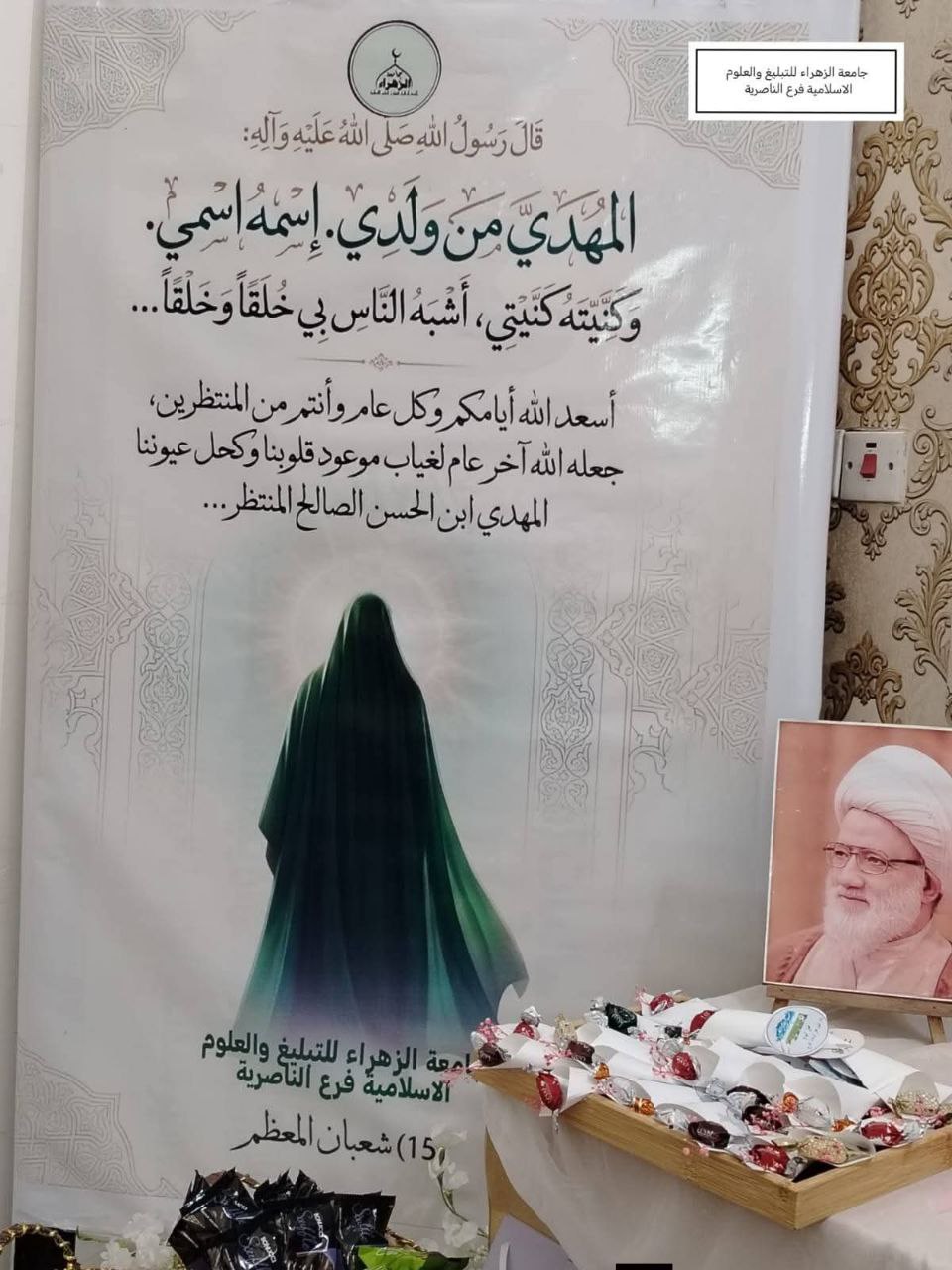 أقامت جامعة الزهراء (ع) في محافظة ذي قار حفلاً دينياً بعنوان “الانتظار وعصر الظهور”، وذلك بمناسبة ذكرى ولادة صاحب العصر والزمان الإمام المهدي المنتظر (عجّ).