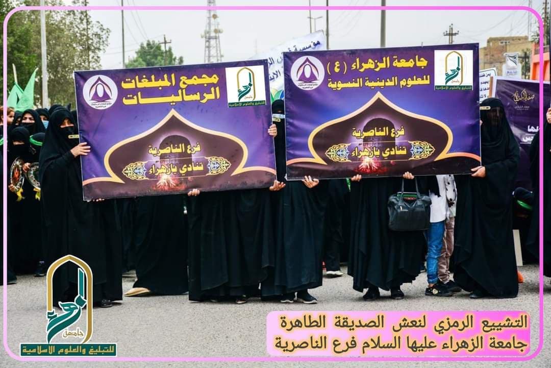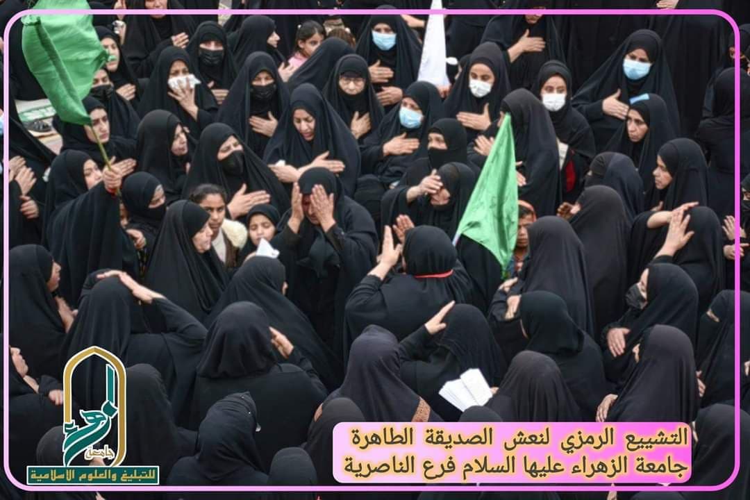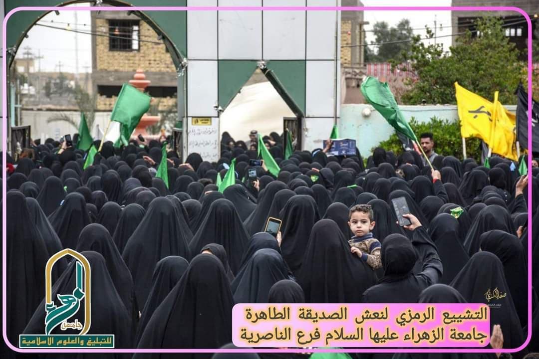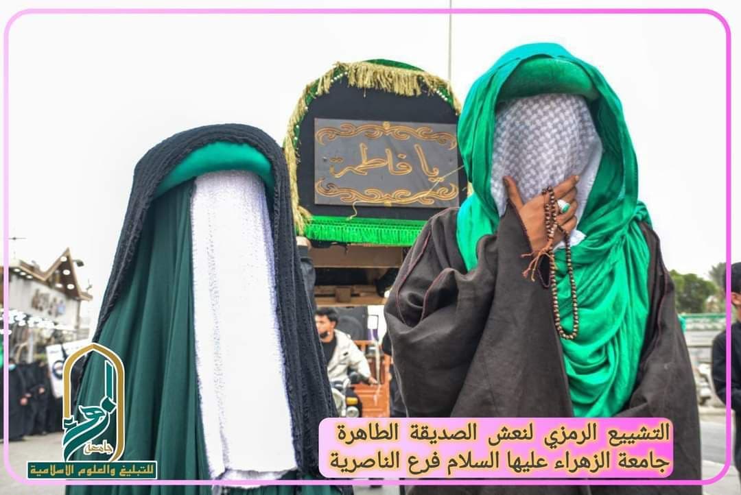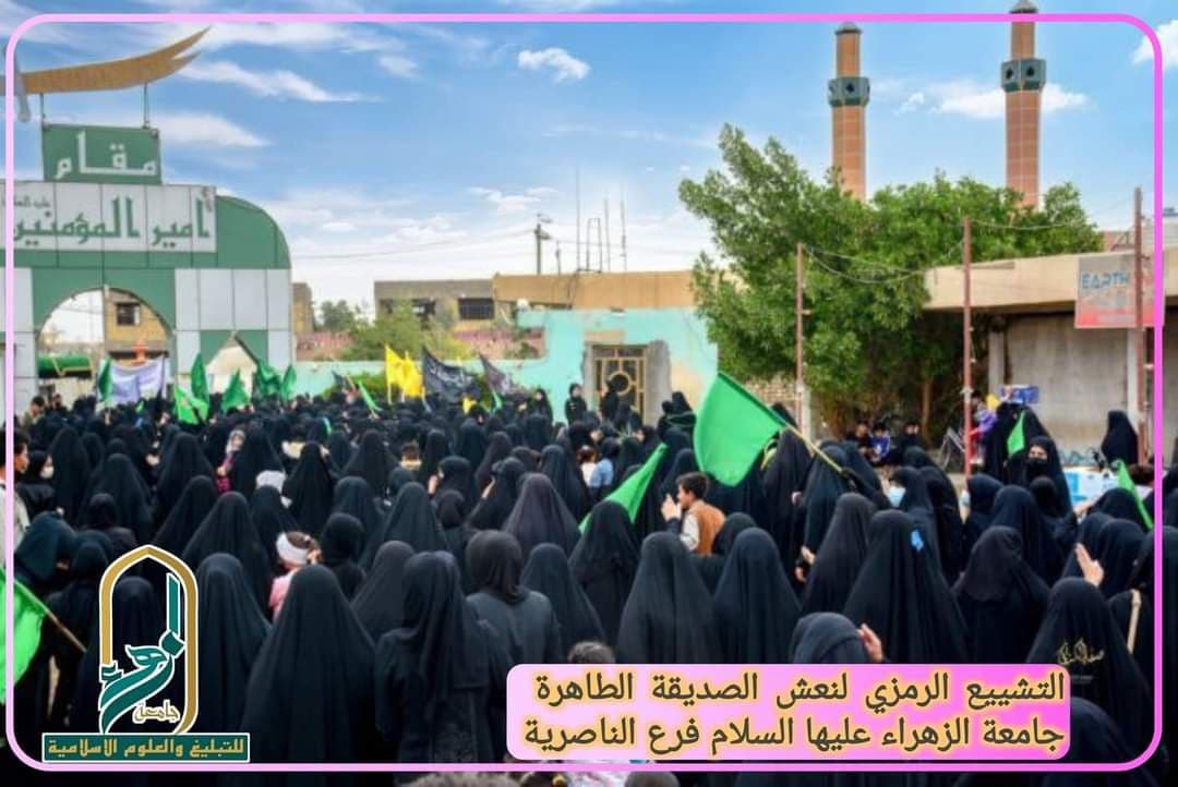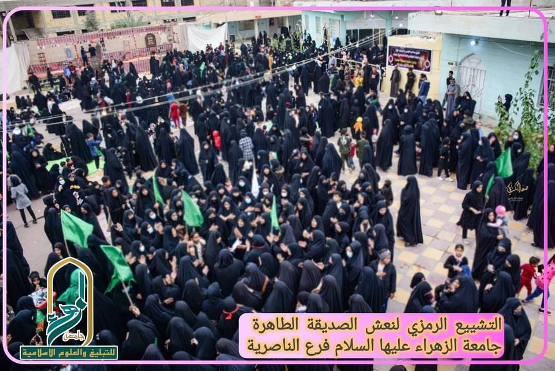 أقامت جامعة الزهراء (ع) للتبليغ والعلوم الإسلامية، ومجمع المبلغات الرساليات فرع الناصرية، وبمشاركة مؤسسة فيض الزهراء (ع)، أمس السبت، التشييع الرمزي لنعش الطاهرة الصديقة فاطمة الزهراء (ع).