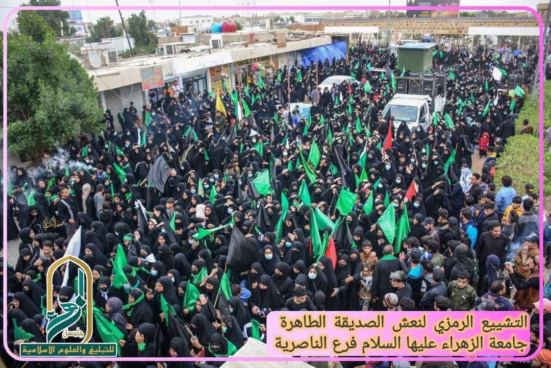وأضاف البيان، “أقامت جامعة الزهراء النسوية للعلوم الدينية ومجمع المبلغات الرساليات فرع الناصرية وبمشاركة مؤسسة فيض الزهراء (ع) فرع الناصرية. التشييع الرمزي لنعش الطاهرة الصديقة (سلام الله عليها)، منطلقاً من جامع الإمام علي (ع) في منطقة الثورة. وصولاً إلى مقام خطوة أمير المؤمنين (ع)، ضمن حشود قاربت الألف من المؤمنات المواليات المعزيات”.