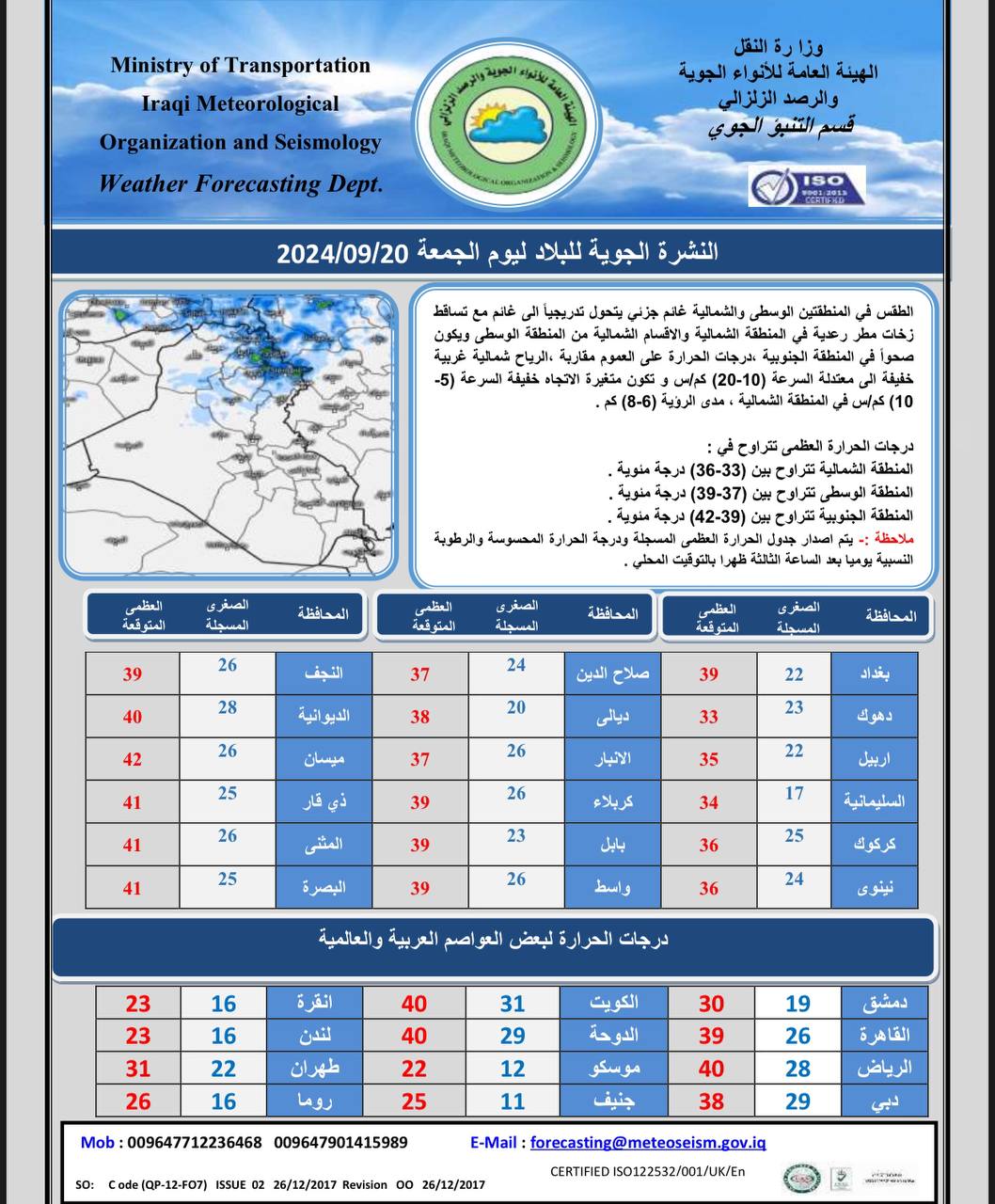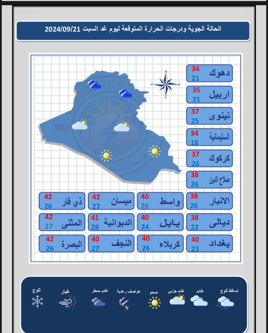 وأفاد بيان للهيئة، تلقت “النعيم نيوز” نسخة منه، بأن “الطقس ليوم غد السبت سيكون في المنطقتين الوسطى والشمالية غائماً جزئياً، ويتحول إلى غائم في المنطقة الشمالية، مع تساقط زخات مطر رعدية في بعض الأماكن منها، ويكون صحواً مع بعض الغيوم في المنطقة الجنوبية، ودرجات الحرارة على العموم ترتفع قليلاً”، مضيفاً أن “درجات الحرارة العظمى ستكون في بغداد وكربلاء المقدسة وواسط وبابل والنجف الأشرف 40، ودهوك والسليمانية 34، والأنبار وصلاح الدين وديالى 38، وميسان وذي قار والمثنى والبصرة 42”.