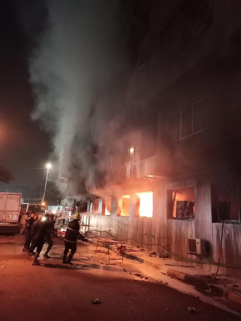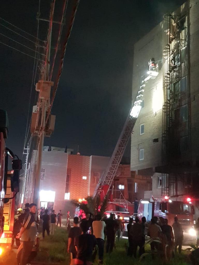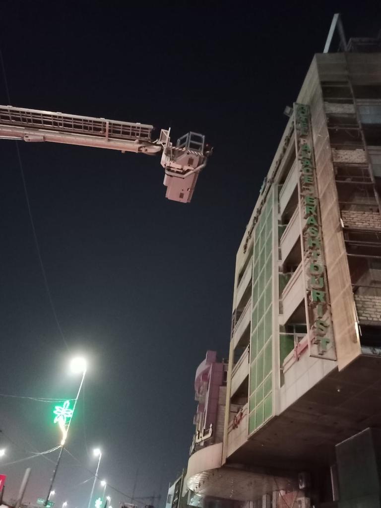 حالتا وفاة و20 حالة اختناق بسبب حريق فندق وسط كربلاء (صور)
