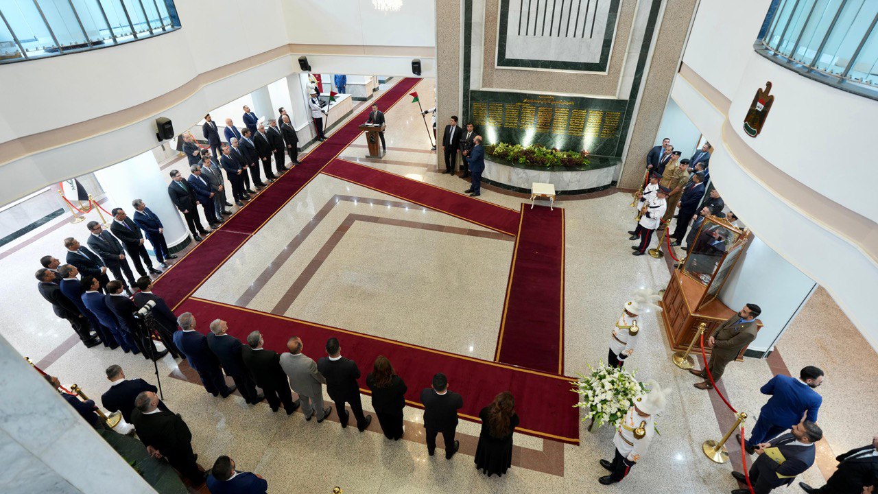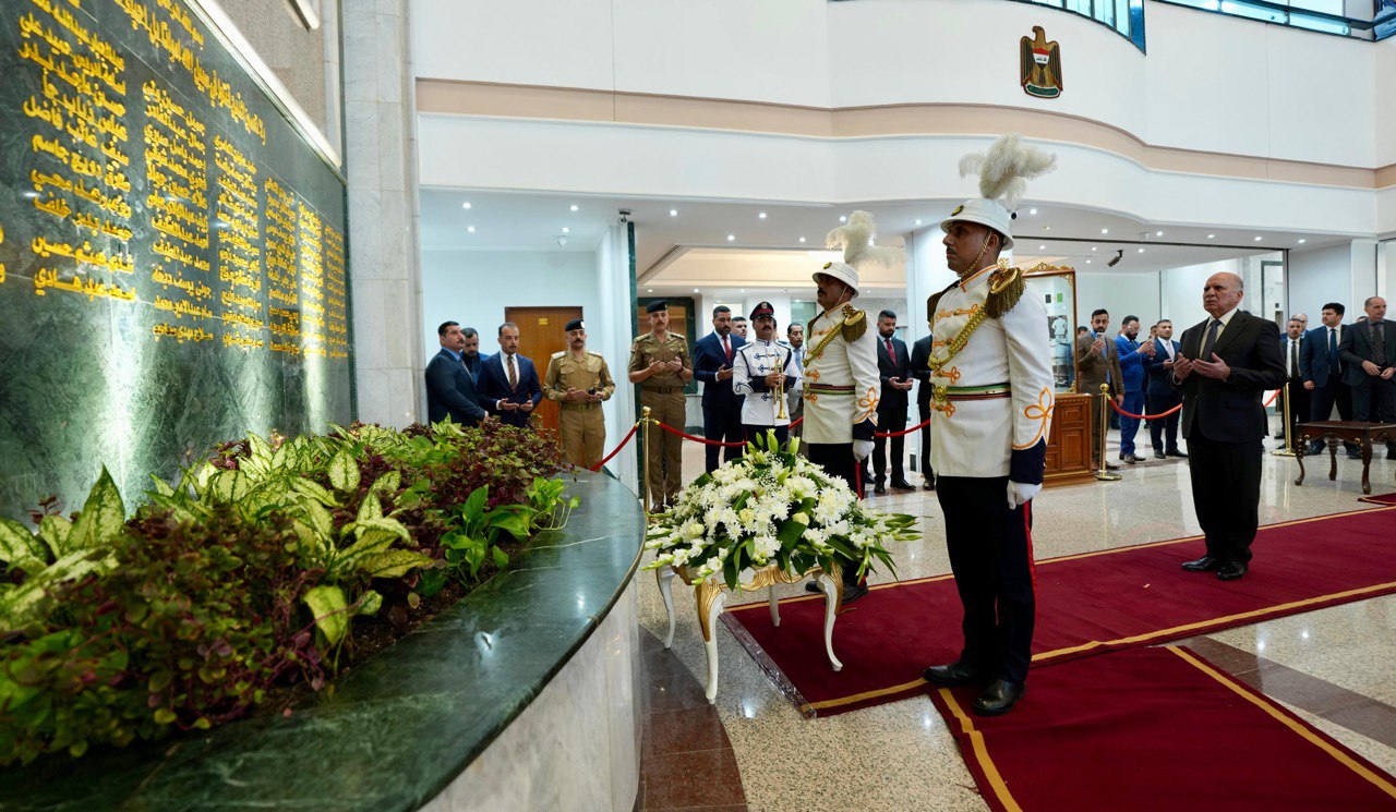 وأضاف، أنه “حضر المراسم: الوكلاء، ورؤساء الدوائر، وعدد من ذوي الشهداء، واستُهلّت الفعالية بتلاوة آيات من الذكر الحكيم، إكراماً لأرواح الشهداء”، مبيّناً أن “وزير الخارجية، يرافقه حرس الشرف، قام بوضع إكليل من الزهور عند لوحة أسماء الشهداء، في لفتة رمزية لاستذكار تضحياتهم الجليلة”.