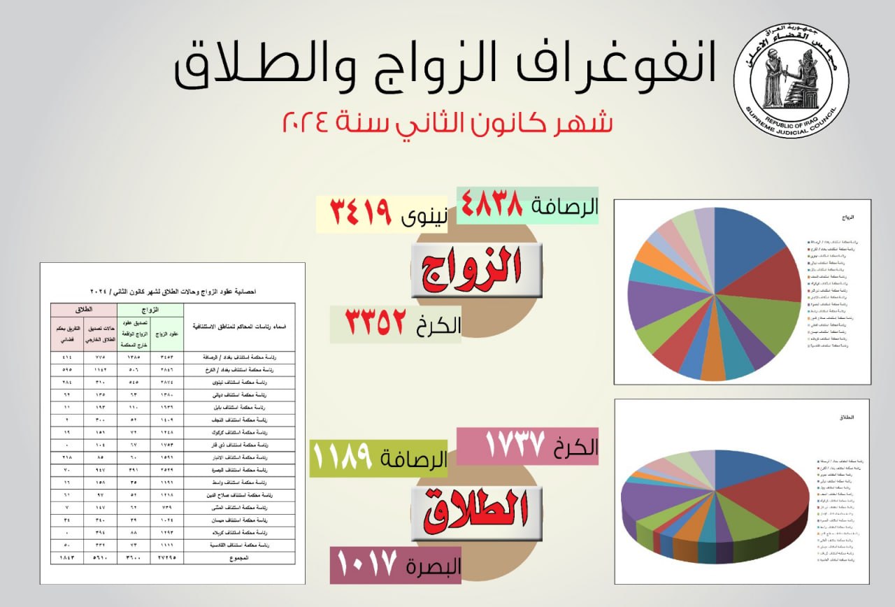 أعلن مجلس القضاء الأعلى، اليوم الاثنين، عن إحصائية عقود الزواج وحالات الطلاق، لشهر كانون الثاني 2024.