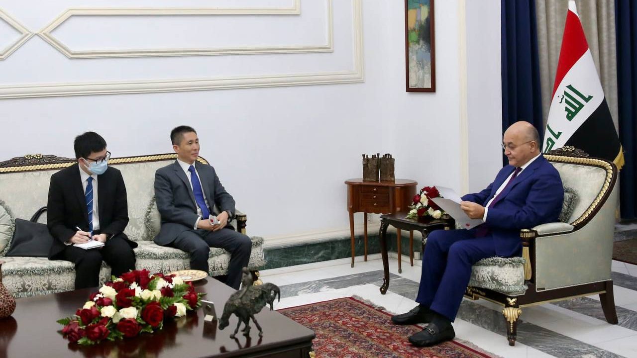 وأضاف، أنه “وفي مستهل اللقاء، سلّم السفير رسالة خطية من الرئيس الصيني شي جين بينغ، إلى الرئيس برهم صالح، متعلقة بالعلاقات الثنائية المتينة التي تجمع البلدين، والعمل على تعزيزها في مختلف المجالات، وبما يحقق المصالح المشتركة للشعبين الصديقين، فيما حمّل الرئيس، السفير الصيني، تحياته وتقديره إلى الرئيس شي جين بينغ”.