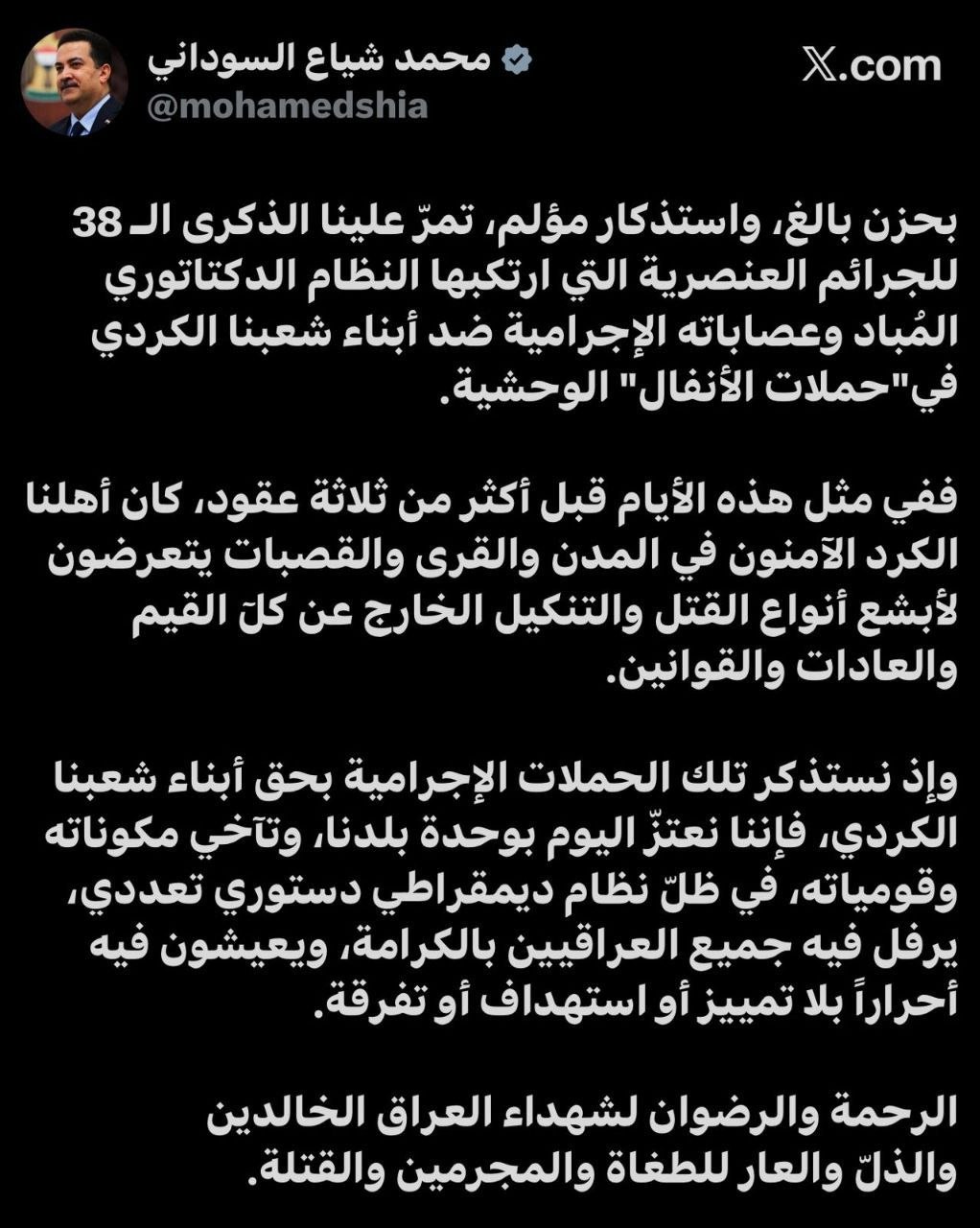 وأضاف رئيس الوزراء، أنه “وإذ نستذكر تلك الحملات الإجرامية بحق أبناء شعبنا الكردي، فإننا نعتزّ اليوم بوحدة بلدنا، وتآخي مكوناته وقومياته، في ظلّ نظام ديمقراطي دستوري تعددي، يرفل فيه جميع العراقيين بالكرامة، ويعيشون فيه أحراراً بلا تمييز أو استهداف أو تفرقة”.
