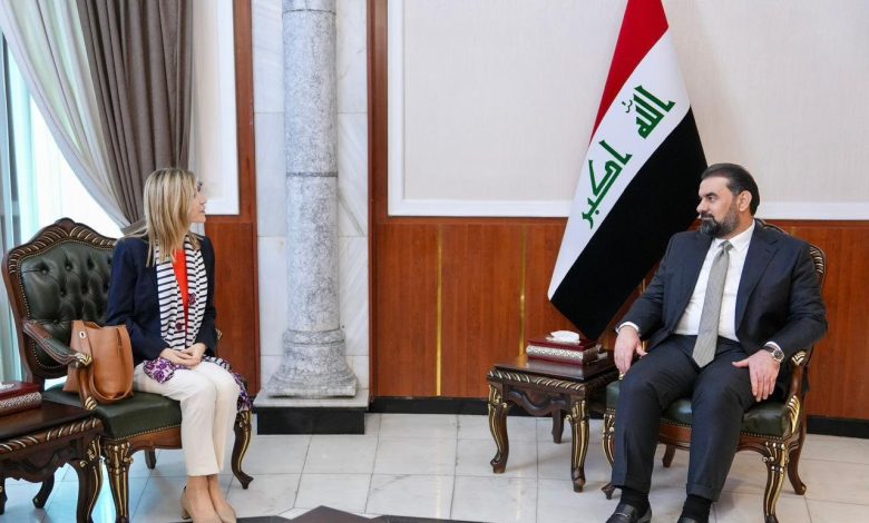 وقال المكتب الإعلامي للحلبوسي، في بيان تلقت “النعيم نيوز” نسخة منه، إن “رئيس مجلس النواب هيبت الحلبوسي استقبل، سفيرةَ مملكة إسبانيا لدى العراق إليثيا ريكو”.