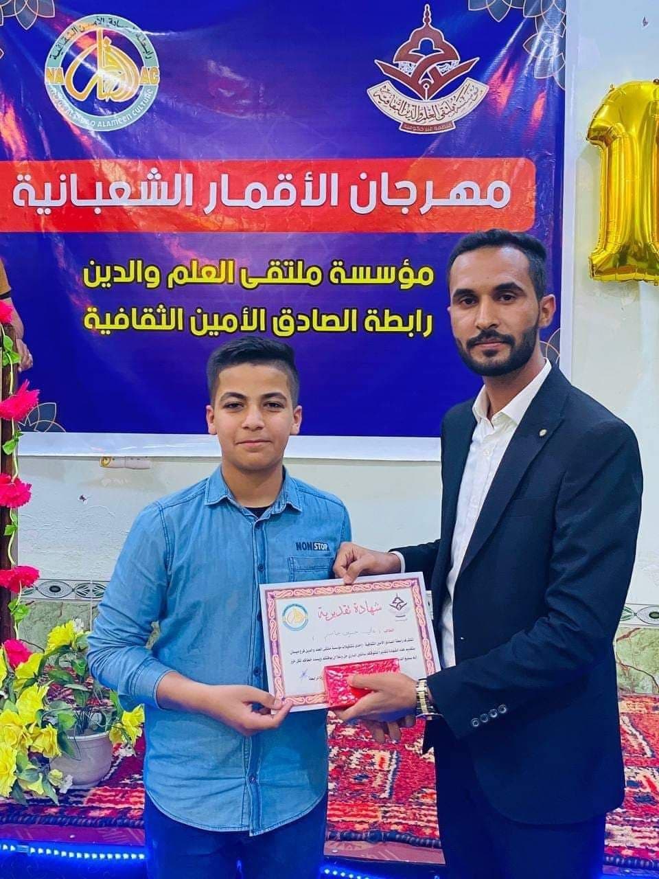 وذكرت المؤسسة في بيان ، تلقت ” النعيم نيوز” نسخة منه، أنه “برعاية مؤسسة ملتقى العلم والدين فرع ميسان كرّمت رابطة الصادق الأمين الثقافية الطلبة المتفوقين من خلال مهرجان أقامته تزامناً مع ذكرى ولادة الإمام المهدي عج”.