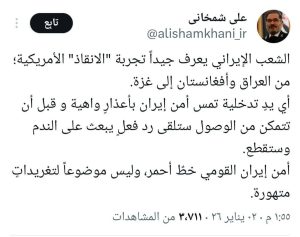 وأضاف شمخاني: “الأمن القومي الإيراني خطٌّ أحمر، وليس موضوعًا للتغريدات المغامرة”.