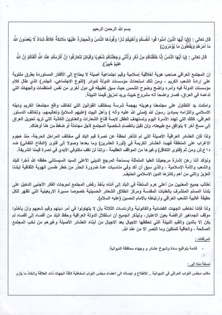 أصدر شيوخ العشائر في محافظة الديوانية، أمس الأربعاء، بياناً بشأن المفاهيم الهدامة للمجتمع، ومنها (الجندرة).