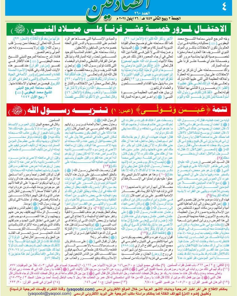 وذكر بيان للمكتب، تلقت “النعيم نيوز” نسخة منه، أن “الصفحة الأولى: {عَبَسَ وَتَوَلَّى} – تنزيه رسول الله (ص)