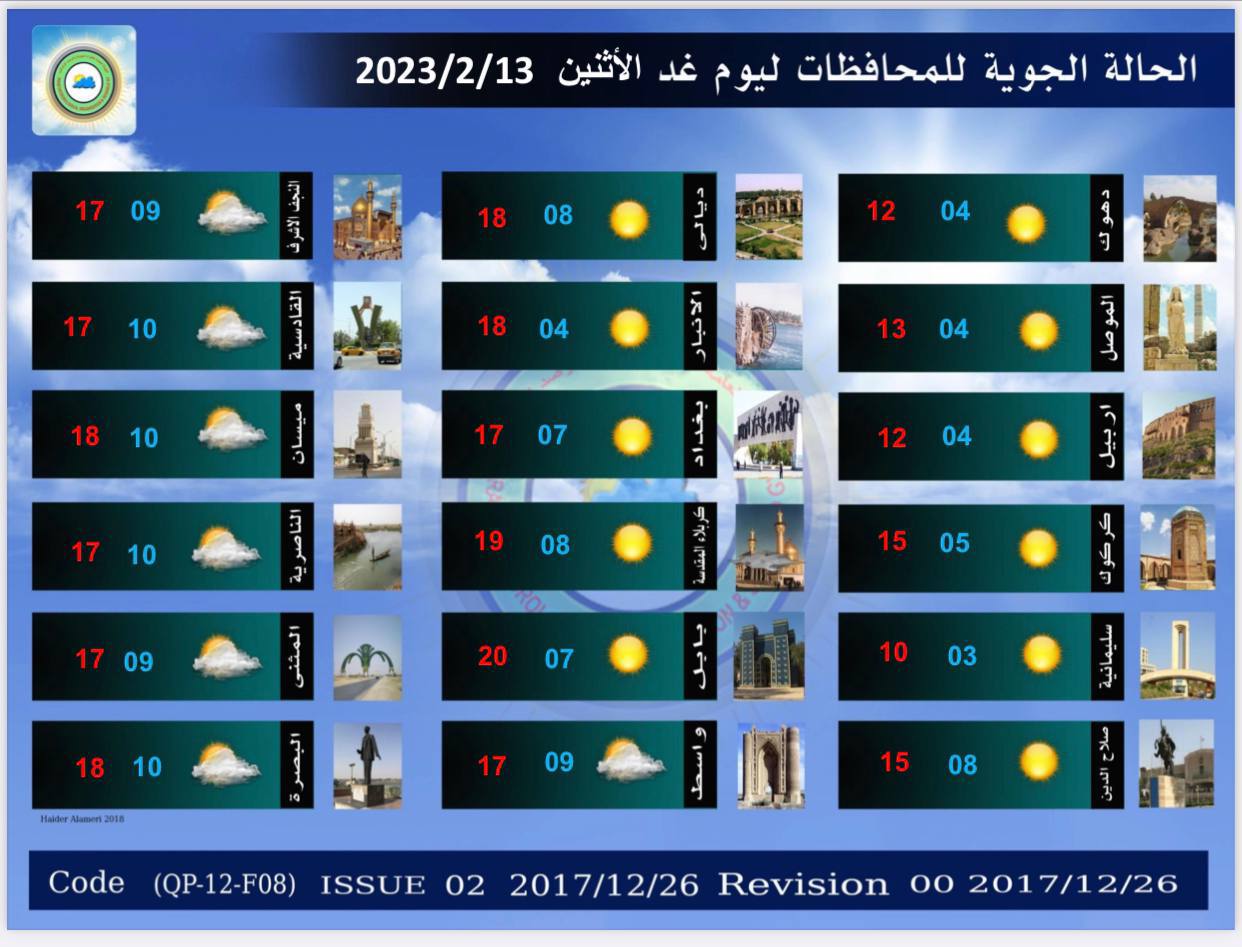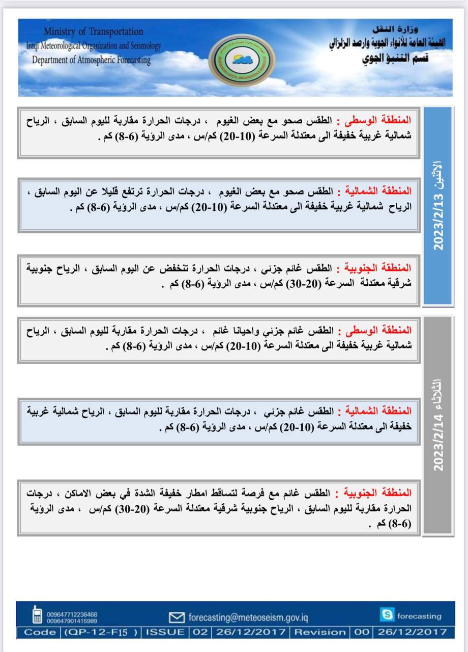 ونوه، إلى أن “طقس البلاد ليوم الخميس المقبل سيكون صحواً مع بعض الغيوم في جميع مناطق البلاد. أما درجات الحرارة فسترتفع قليلاً عن اليوم السابق في الأقسام الوسطى والجنوبية. وتكون مقاربة لليوم السابق في القسم الشمالي من البلاد”.