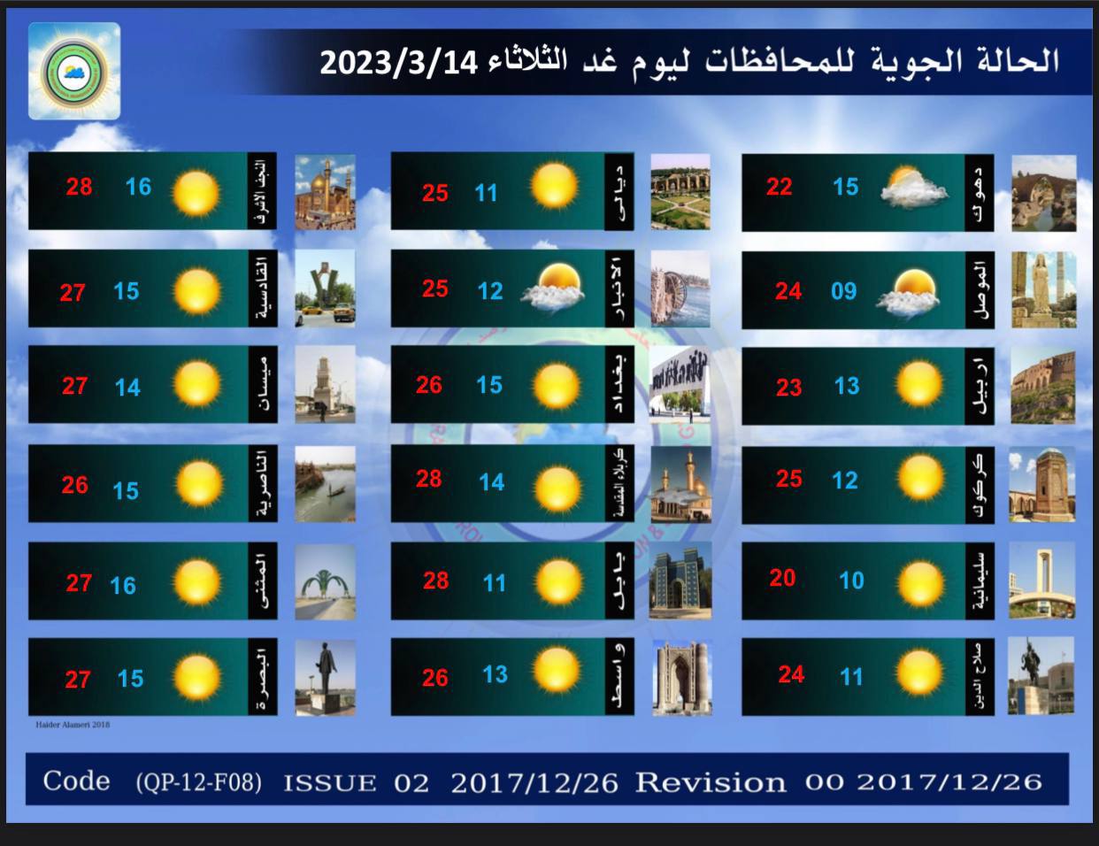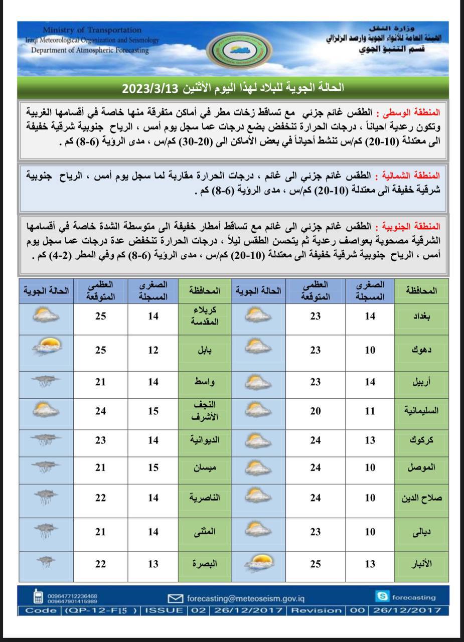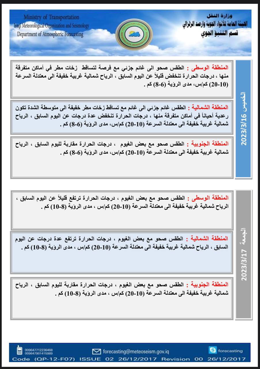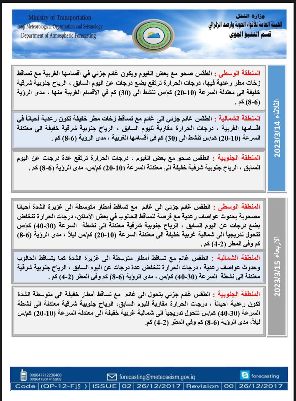 وأشار البيان، إلى أن “طقس يوم الأربعاء في المنطقة الوسطى سيكون غائماً جزئياً إلى غائم جزئي مع تساقط أمطار متوسطة إلى غزيرة الشدة أحياناً. مصحوب بحدوث عواصف رعدية مع فرصة لتساقط الحالوب في بعض الأماكن. ودرجات الحرارة تنخفض بضع درجات عن اليوم السابق”.