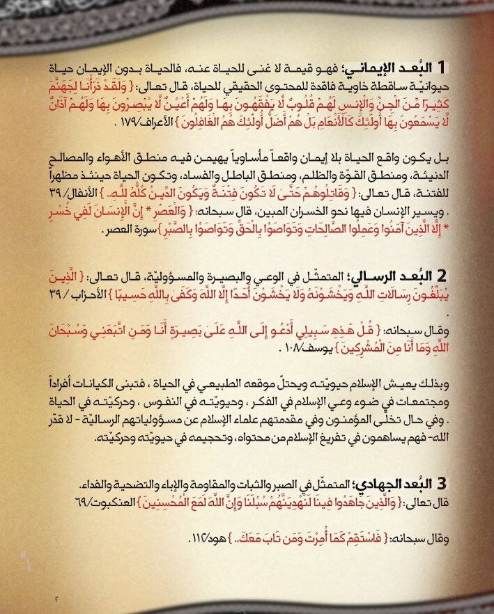 ١- البُعد الإيماني، فهو قيمة لا غنى للحياة عنه، فالحياة بدون الإيمان حياة حيوانيَّة ساقطة خاوية فاقدة للمحتوى الحقيقي للحياة، قال تعالى: {وَلَقَدْ ذَرَأْنَا لِجَهَنَّمَ كَثِيرًا مِّنَ الْجِنِّ وَالْإِنسِ لَهُمْ قُلُوبٌ لَّا يَفْقَهُونَ بِهَا وَلَهُمْ أَعْيُنٌ لَّا يُبْصِرُونَ بِهَا وَلَهُمْ آذَانٌ لَّا يَسْمَعُونَ بِهَا أُولَٰئِكَ كَالْأَنْعَامِ بَلْ هُمْ أَضَلُّ أُولَٰئِكَ هُمُ الْغَافِلُونَ} الأعراف ١٧٩.