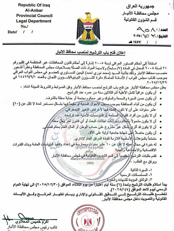 ووفقاً لوثيقة موقعة من نائب رئيس مجلس محافظة الأنبار، حصلت عليها “النعيم نيوز”، أنه “تقرر فتح باب الترشيح لمنصب محافظ الأنبار”، وفيما يلي الوثيقة أدناه: