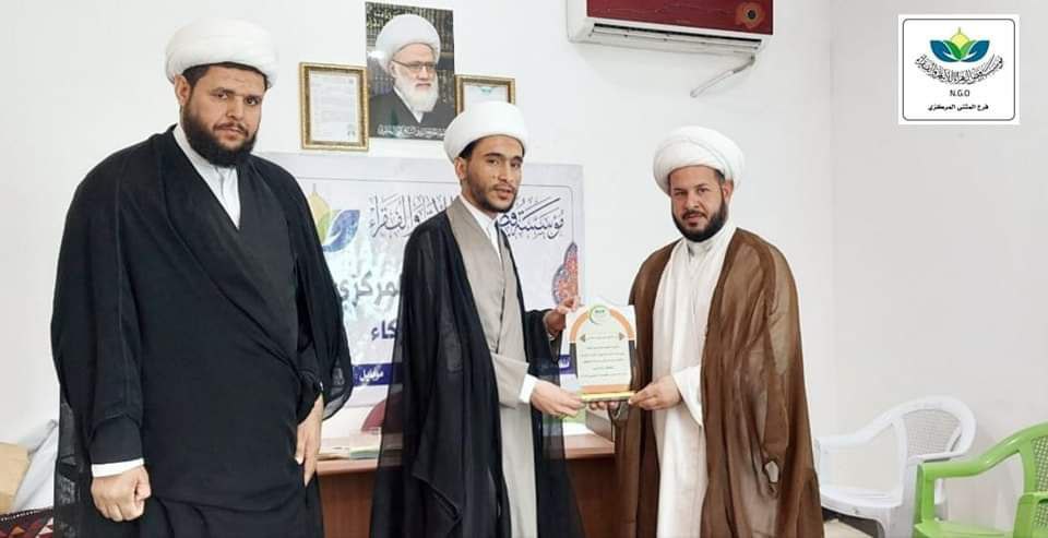 كرّم مدير مؤسسة فيض الزهراء(ع) لرعاية الايتام والفقراء فرع المثنى الشيخ ياسين السماوي مدير مكتب المؤسسة في الوركاء فضيلة الشيخ علي الظالمي تثميناً لجهوده المباركة والخيرية في مساعدة العوائل الفقيرة المتعففة في قضاء الوركاء.