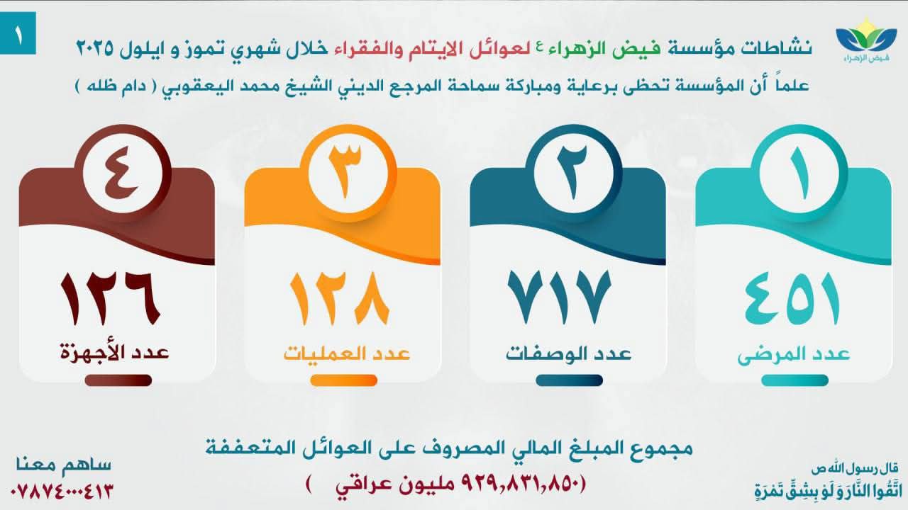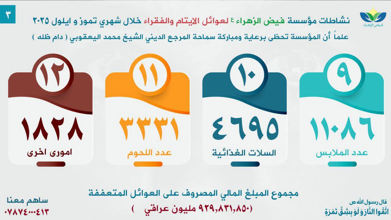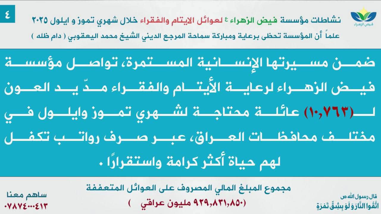 أعلنت مؤسسة فيض الزهراء (ع) لرعاية الأيتام والفقراء، اليوم الخميس، عن صرف مبلغ إجمالي قدره 929.831.850 ديناراً عراقياً خلال شهري تموز وأيلول من عام 2025، حيثُ شملت دعماً شاملاً في المجالات الصحية والمعيشية والاجتماعية.