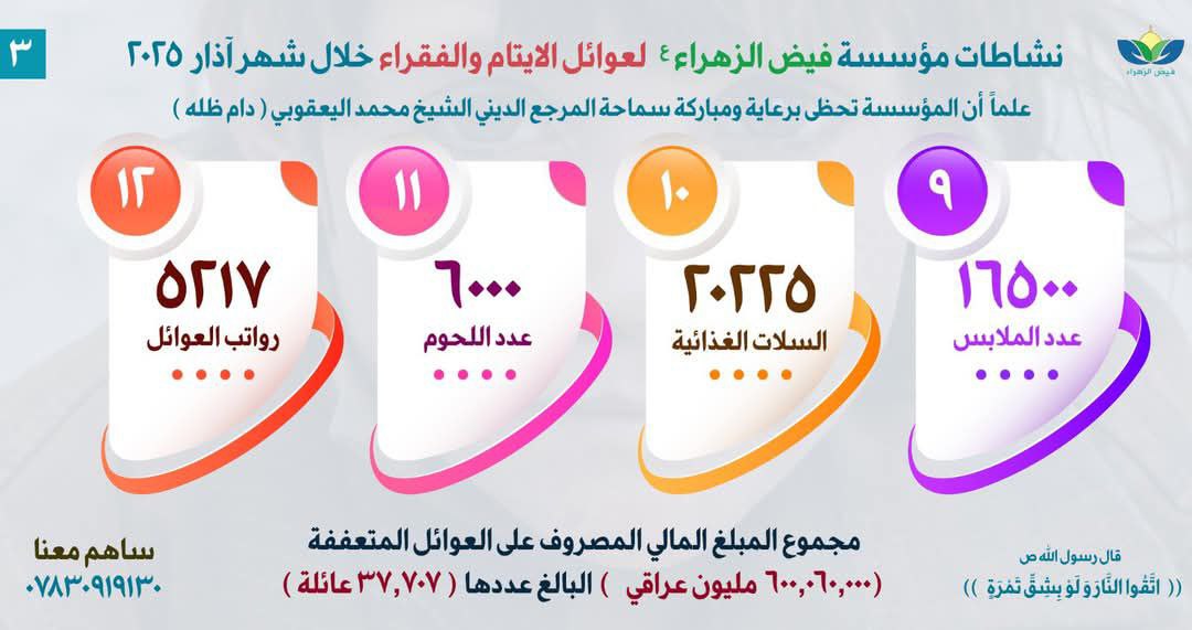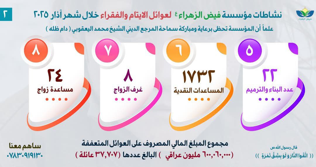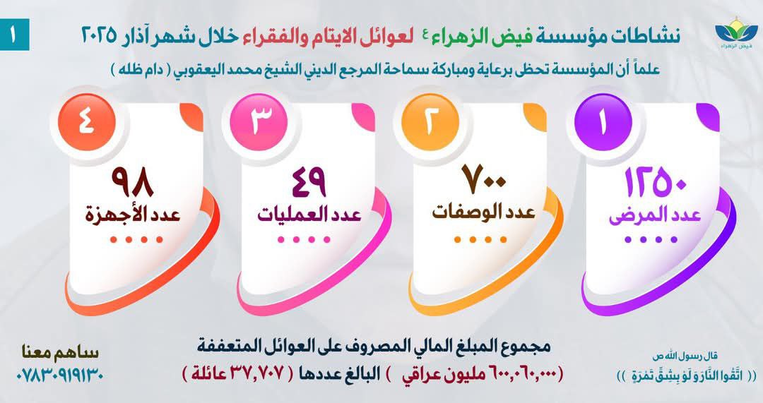 يُذكر أن مؤسسة فيض الزهراء (ع) لرعاية الأيتام والفقراء، تعمل برعاية سماحة المرجع الديني الشيخ محمد اليعقوبي، ومقرها العام في النجف الأشرف، وتضم شبكة واسعة من الفروع بلغت 140 فرعاً ومكتباً موزعة في عموم مدن العراق، وتُشرف على رعاية أكثر من 60 ألف يتيم وفقير.