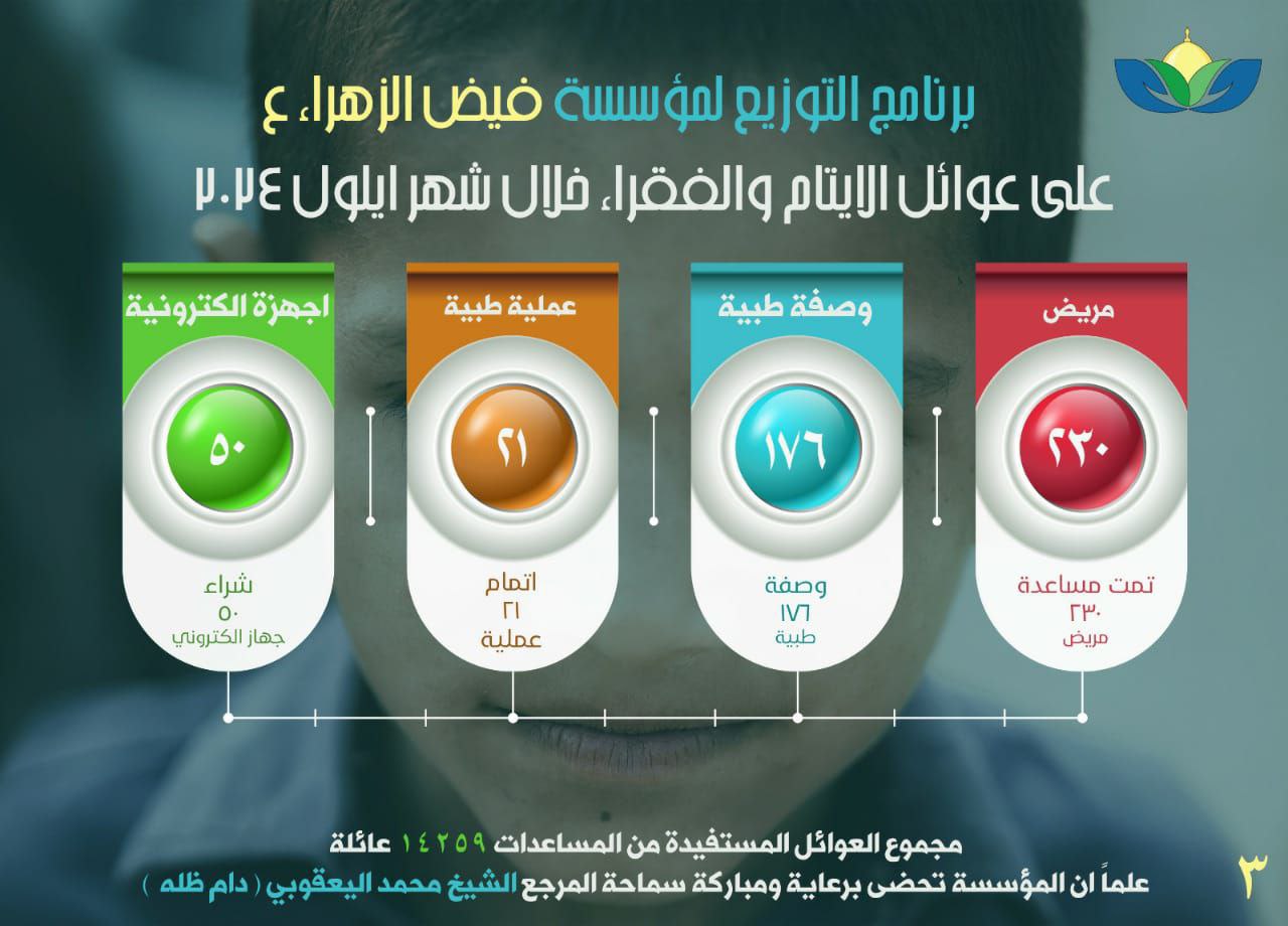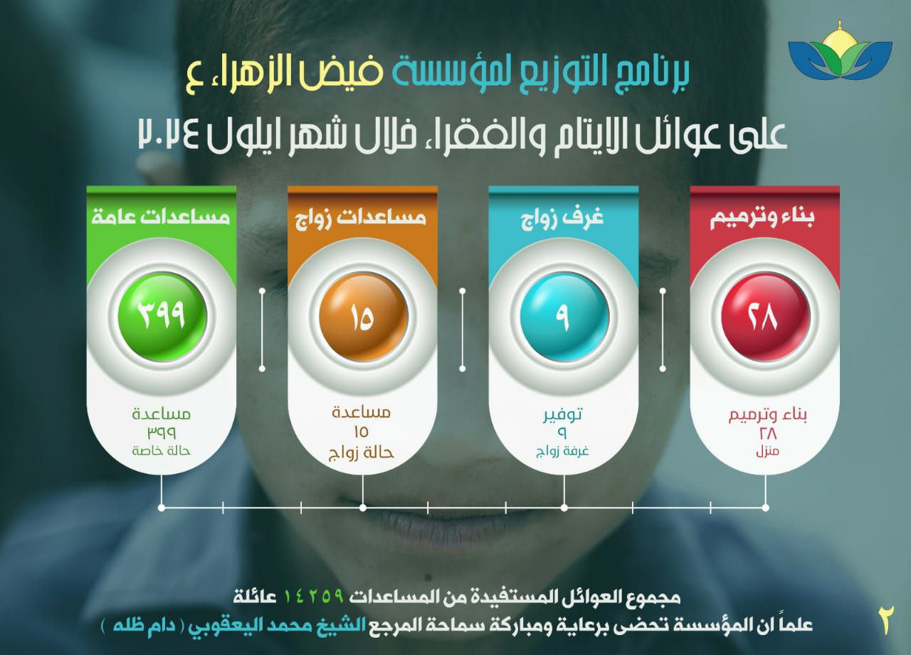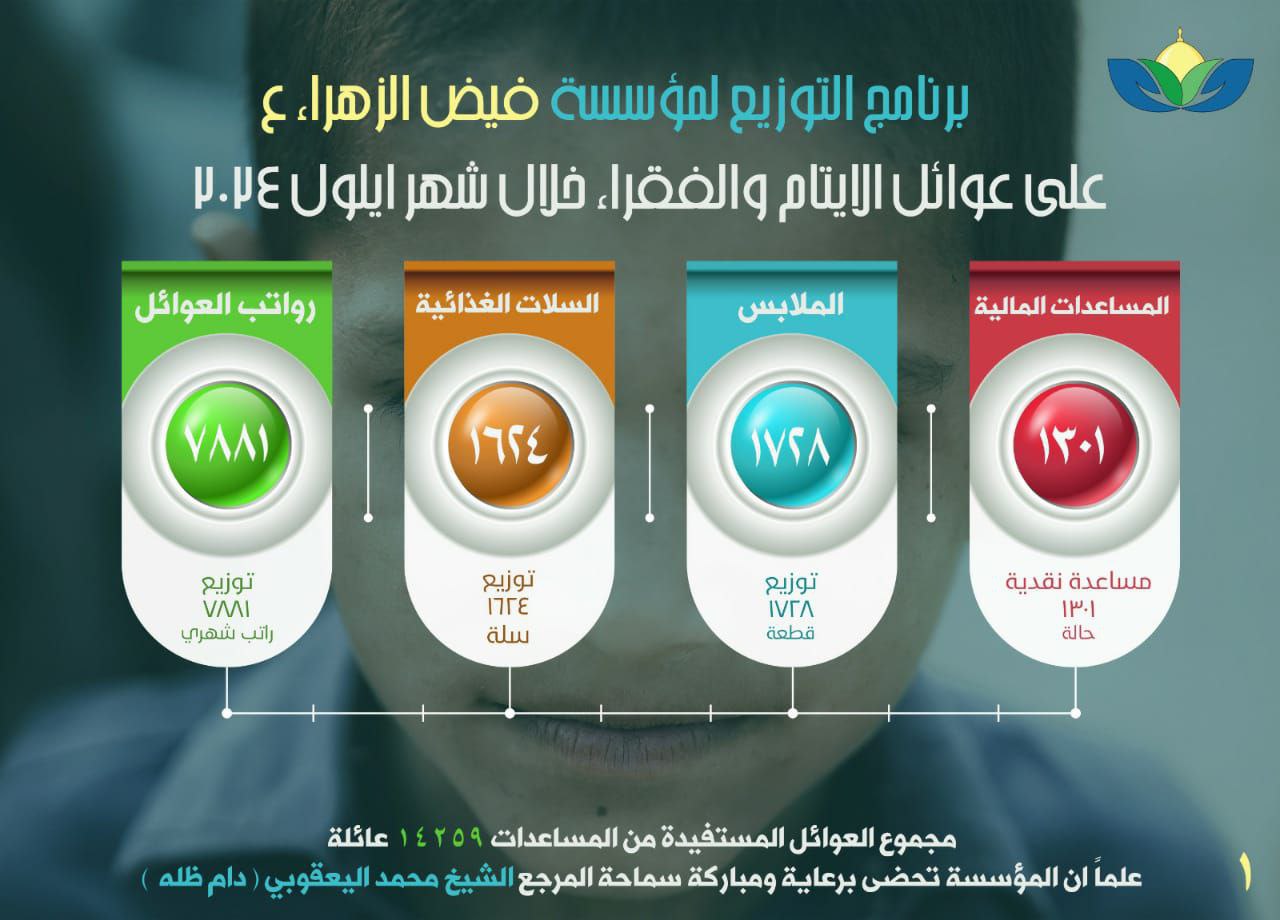 يُذكر أن مؤسسة فيض الزهراء (ع) لرعاية الأيتام والفقراء، تعمل برعاية مكتب سماحة المرجع الديني الشيخ محمد اليعقوبي، ومقرها العام في النجف الأشرف، وتضم ١٤٠ فرع ومكتب منتشرة في عموم مُدن العراق، وترعى أكثر من ٦٠ ألف يتيم وفقير.