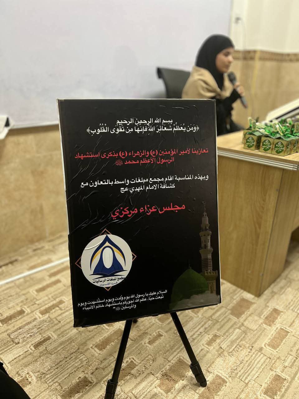 أعلن مجمع المبلغات الرساليات، اليوم الأحد، أنه أقام وبالتعاون مع كشافة الإمام المهدي (عج) في واسط، مجلس عزاء مركزي، بمناسبة ذكرى استشهاد الرسول الأعظم محمد (ص).