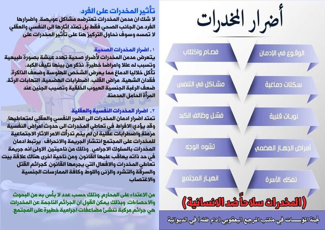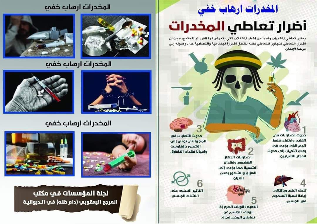 وذكرت اللجنة في بيان تلقت “النعيم نيوز” أن “لجنة المؤسسات التابعة لمكتب سماحة المرجع الديني الشيخ محمد اليعقوبي في الديوانية، وقفه توعية وحملة توزيع فولدرات وملصقات للحد من خطر المخدرات في ساحة الراية مركز محافظة الديوانية.