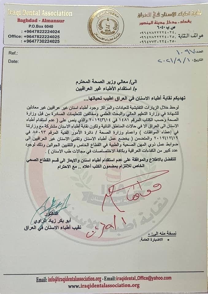 أعلنت نقابة أطباء الأسنان، اليوم الخميس، عن إيقاف استقدام أطباء أسنان غير عراقيين، لوجود عدد كافٍ وفي جميع التخصصات.