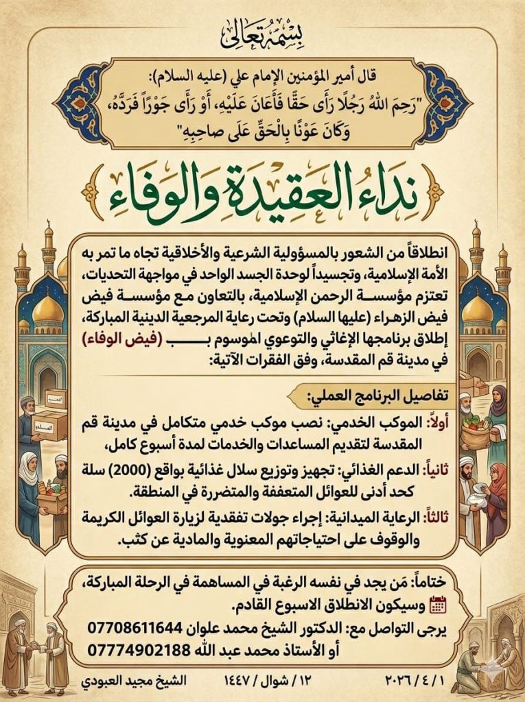 وذكر بيان للمؤسسة، تلقت “النعيم نيوز” نسخة منه، “(نداءُ العقيدة والوَفاء).. انطلاقاً من الشعور بالمسؤولية الشرعية والأخلاقية تجاه ما تمر به الأمة الإسلامية، وتجسيداً لوحدة الجسد الواحد في مواجهة التحديات، تعتزم مؤسسة الرحمن الإسلامية، بالتعاون مع مؤسسة فيض الزهراء (عليها السلام) وتحت رعاية المرجعية الدينية المباركة، إطلاق برنامجها الإغاثي والتوعوي الموسوم بـ (فيض الوفاء) في مدينة قم المقدسة”.