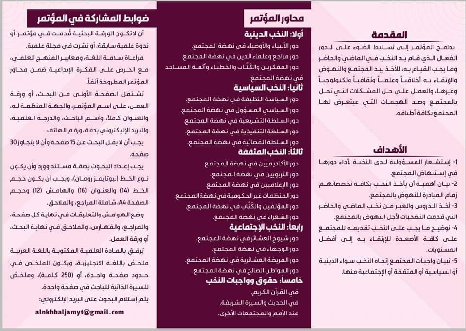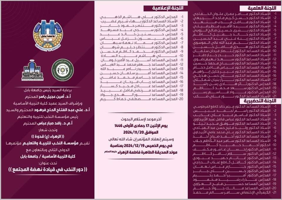 وذكر بيان للمؤسسة، تلقت “النعيم نيوز” نسخة منه، أنه “تحت شعار (الزهراء عليها السلام قدوة)، تقيم مؤسسة النخب للتربية والتعليم، مؤتمرها الدولي الثاني، وبالتعاون مع كلية التربية الأساسية جامعة بابل، تحت عنوان: (دور النخب في قيادة نهضة المجتمع)، يوم الخميس المصادف ١٩ / ١٢ / ٢٠٢٤”.