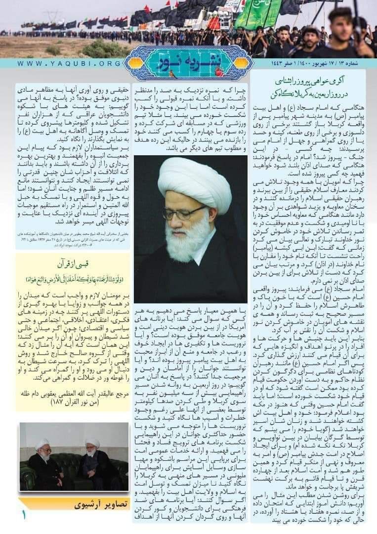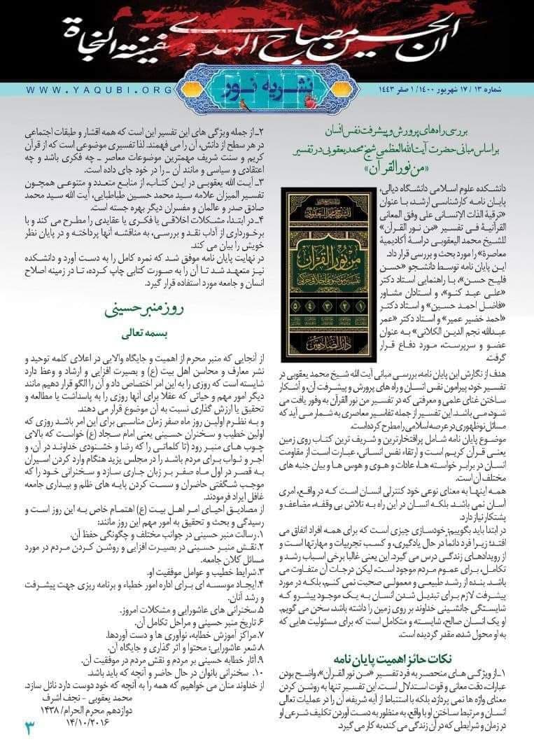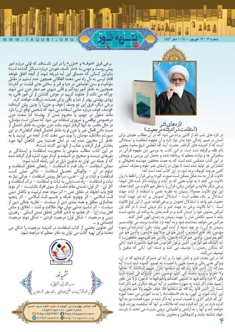 وأشارت، إلى أن “الصفحة الرابعة من النشرة تناولت تقریراً حول إصدار جدید لمؤسسة نور للتحقیق والنشر تحت عنوان (استقامت در اندیشه مرجعیت). اقتباساً من أفکار و آراء سماحة المرجع الدیني آية الله العظمى الشيخ محمد اليعقوبي (دام ظله)”.