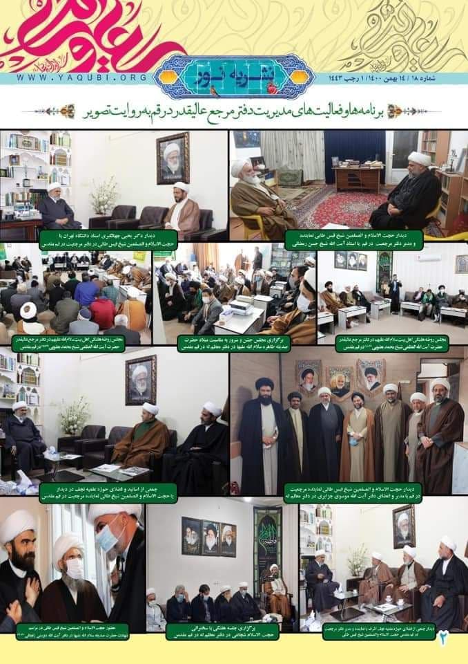 وأضافت، أن “العدد الثامن عشر من النشرة في الصفحة الأولى، تناول بيان لسماحة المرجع الدیني الیعقوبي (دام ظله). ذيل عنوان (أول رجب بداية السنة المعنوية) الذي ألقاه سماحته في النجف الأشرف. في أثناء بحثه خارج الفقه علی طلبته، وأیضاً تحتوي علی استفتاء من سماحته. حول (الإذن بصرف الحقوق الشرعية)”.