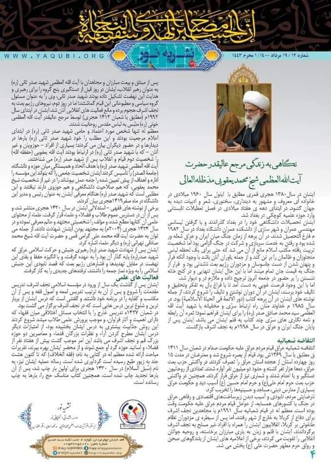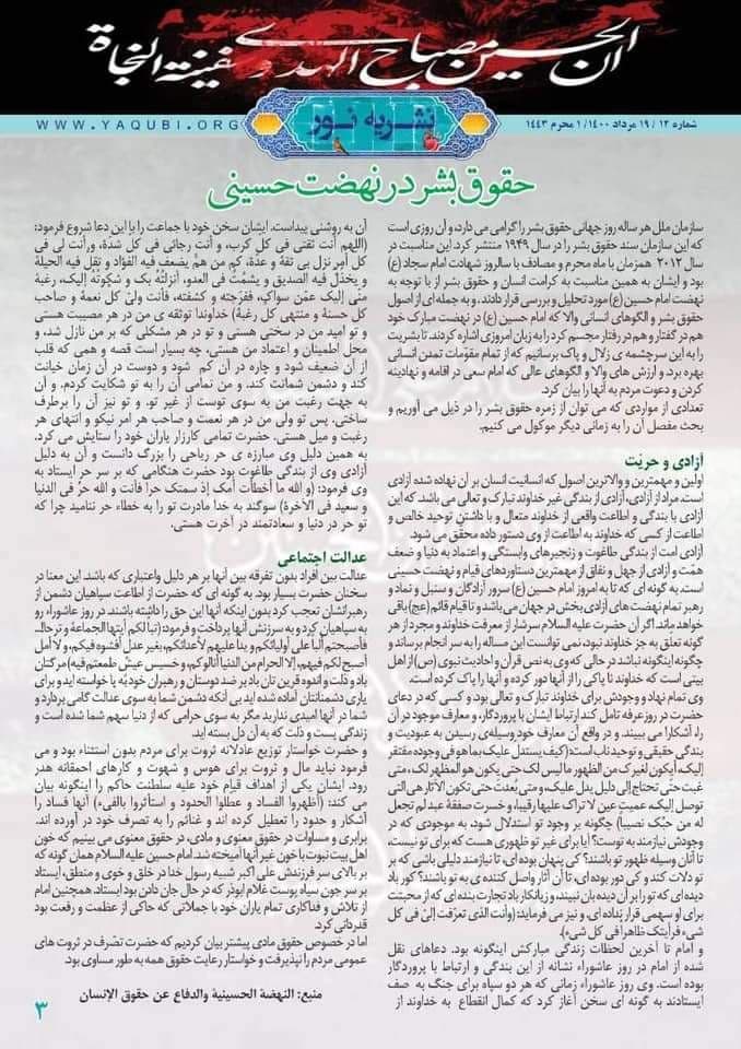 وأشارت المؤسسة، إلى أنه “فی الصفحة الثالثة ذكرت دروس من النهضة الحسينية اقتباساً من خطبة لسماحة المرجع بعنوان النهضة الحسينية والدفاع عن حقوق الإنسان. فيما تناولت الصفحة الرابعة من النشرة مختصر من حياة ونشاطات. سماحة المرجع الدیني آية الله العظمى الشيخ محمد اليعقوبي (دام ظله)”.