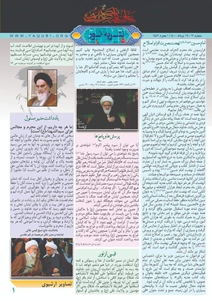 وأضافت، أن “العدد الثاني عشر من النشرة تناول في الصفحة الأولى بيان سماحة المرجع الإمام “الحسين (ع) حركة وعي و إصلاح”. وأيضاً قبس من نور القرآن من خطب سماحته، وسؤال وجواب من كتاب فقه الحياة لسماحة المرجع. وكلمة لممثل المرجعية في قم حول كلمة من السید الإمام الخمینی (رحمة الله علیه). وهي: كل ما لدينا من محرم و عاشوراء. وأیضاً احتوت النشرة بعض من نشاطات مکتب سماحة المرجع الیعقوبی فی قم المقدسة”.