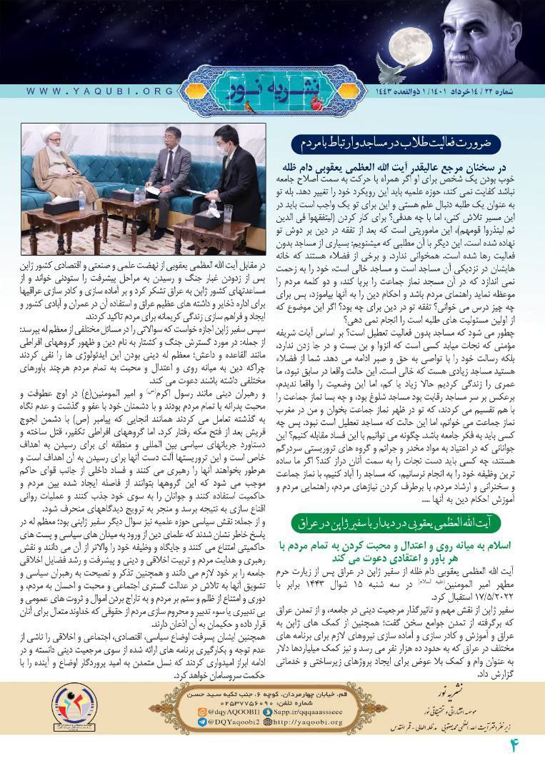 برعاية مكتب سماحة المرجع الديني اية الله العظمى الشيخ محمد اليعقوبي في قم اصدرت مؤسسة نور للترجمة و التحقيق و النشر نشرة نور العدد الثاني و العشرون باللغة الفارسية.