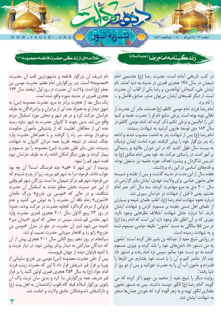 وأضاف “تناول العدد الثاني و العشرون من النشرة في الصفحة الاولى کلمة لسماحة المرجع الدیني الیعقوبي في شخصیة السید الامام الخمینی (ره)، وایضا استفتاء من سماحته حول (من لم يتخذ رأس سنة خمسية)، و ایضا سؤال و جواب مستلّ من کتاب لسماحته بعنوان (الاسئلة والأجوبة)”.