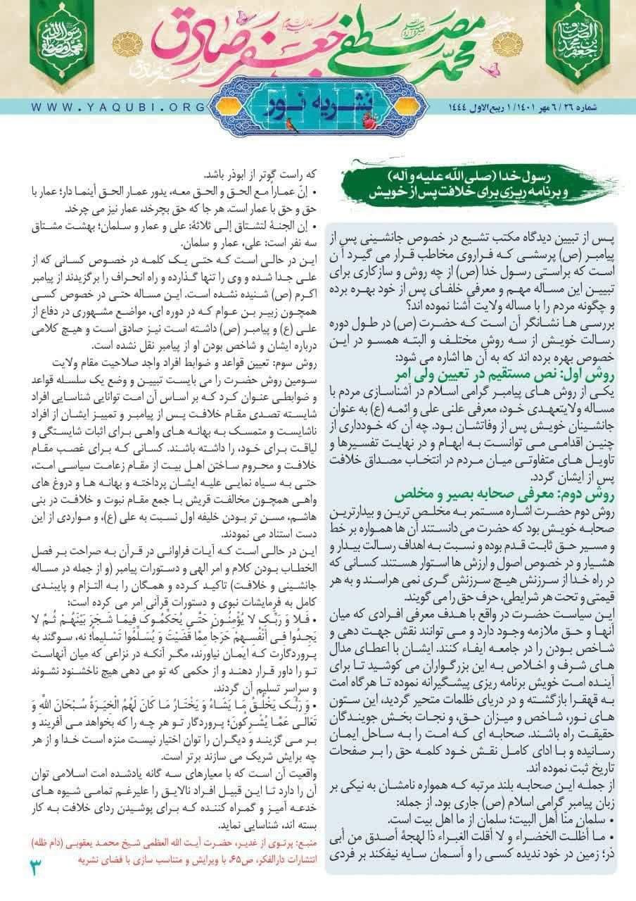 اصدرت مؤسسة نور للترجمة و التحقيق و النشر نشرة نور العدد السادس و العشرون باللغة الفارسية. برعاية مكتب سماحة المرجع الديني اية الله العظمى الشيخ محمد اليعقوبي في قم
