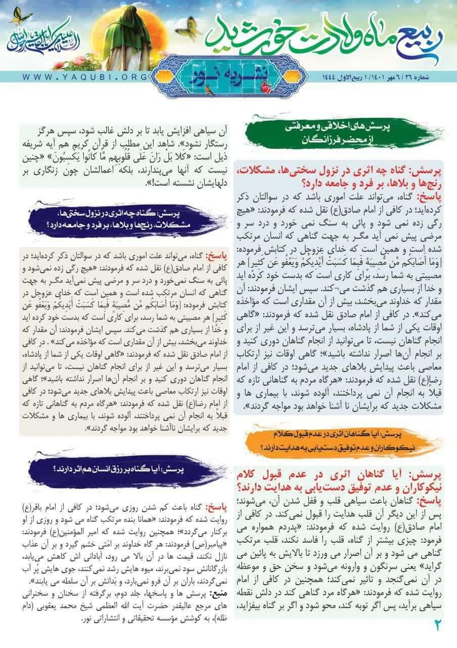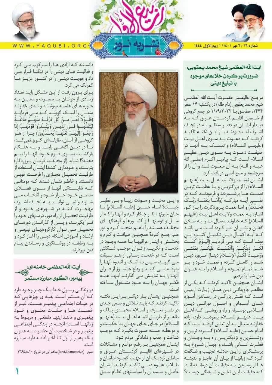نشرة نور تختص بنشر فكر سماحة المرجع اليعقوبي حفظه الله و اخبار مكتبه في مدينة قم المقدسة باللغة الفارسية.