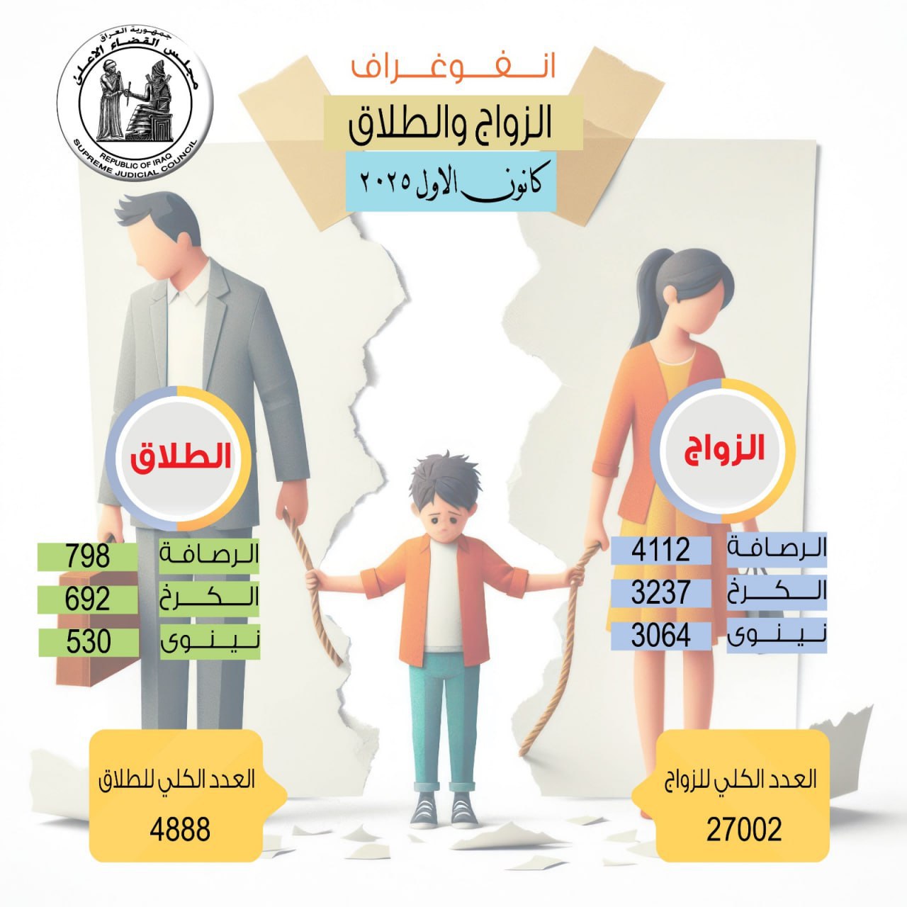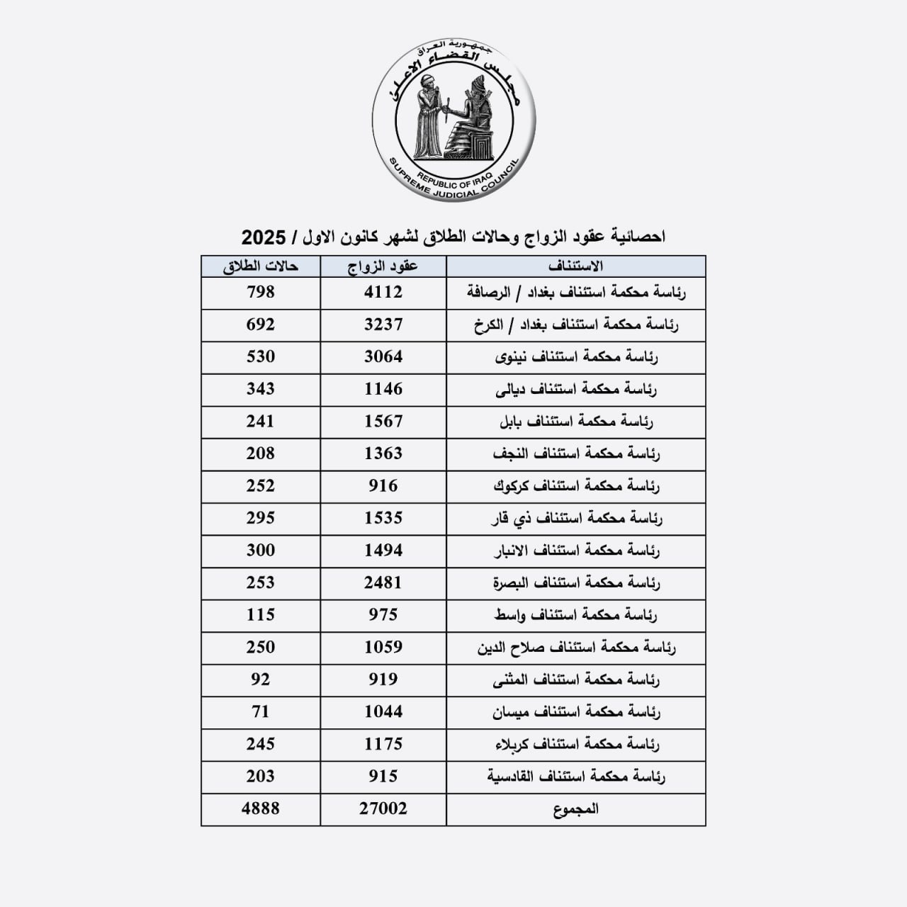 نشر مجلس القضاء الأعلى، اليوم الاثنين، إحصائية عقود الزواج وحالات الطلاق في جميع المحاكم العراقية، لشهر كانون الأول من عام 2025.