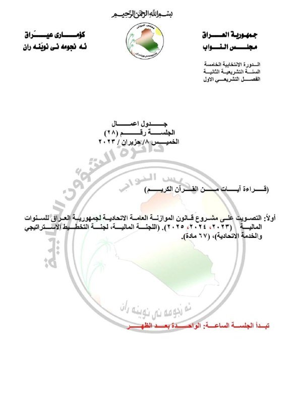 وقالت الدائرة في بيان، تلقت “النعيم نيوز” نسخة منه، إن “جلسة الخميس المقبل لمجلس النواب ستتضمن التصويت على مشروع قانون الموازنة العامة الاتحادية لجمهورية العراق للسنوات المالية (2023,2024,2025)”.