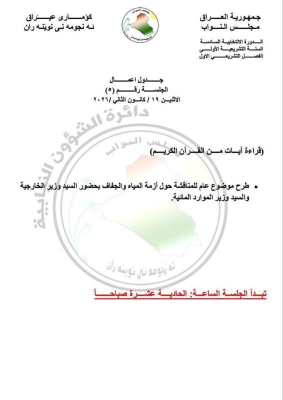 وذكرت الدائرة في بيان، تلقت “النعيم نيوز”نسخة منه، أن “جلسة الاثنين المقبل، تتضمن طرح موضوع عام للمناقشة حول أزمة المياه والجفاف، بحضور وزير الخارجية فؤاد حسين، ووزير الموارد المائية عون ذياب عبد الله”.