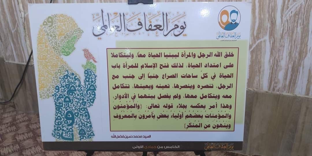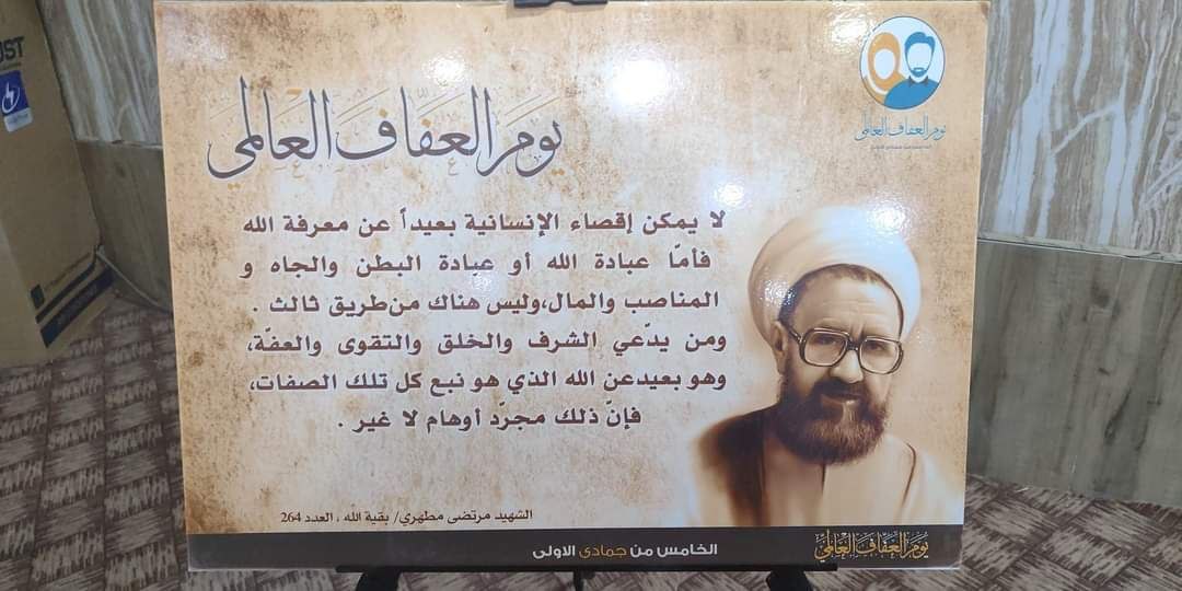 أعلن مجمع المبلغات الرساليات في قضاء القرنة، اليوم الأحد، أنه أقام وبالتعاون مع جامعة الزهراء (ع) للتبليغ والعلوم الإسلامية، احتفاليّة يوم العفاف العالمي.