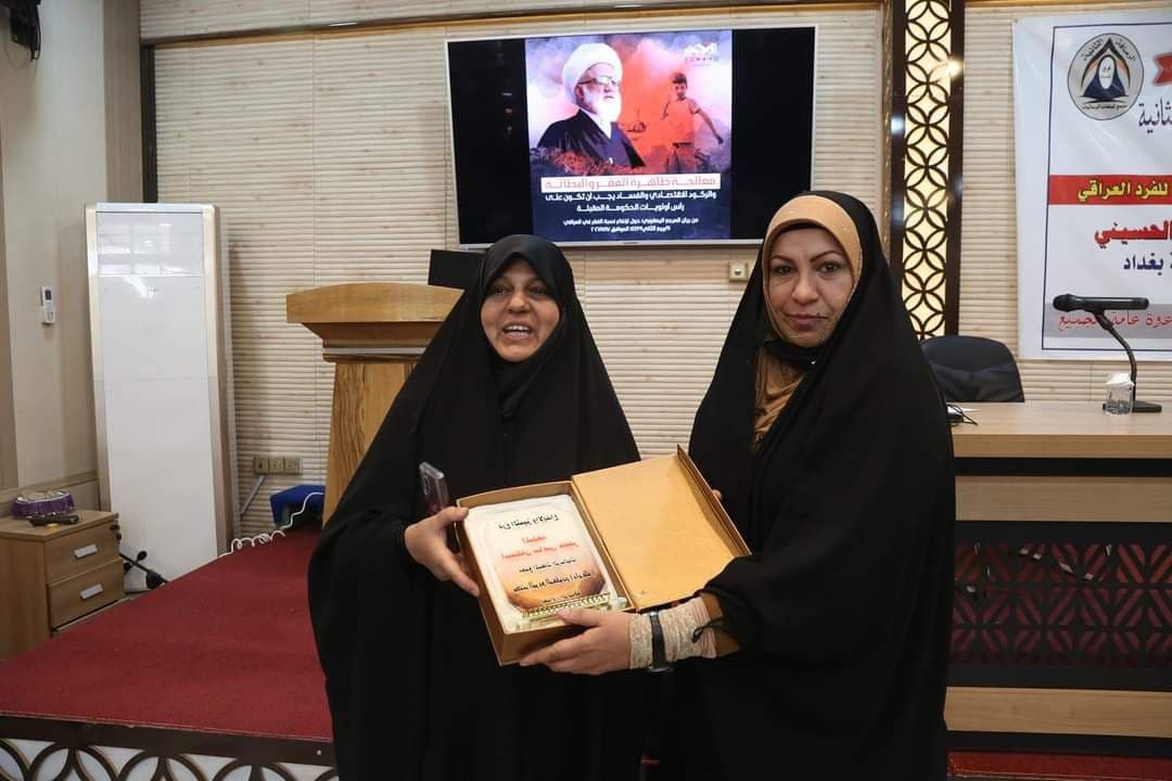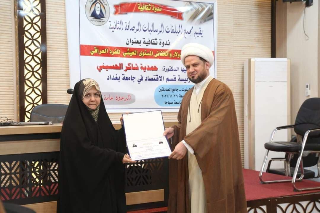 وفي الختام، كرم الشيخ مجيد العبودي، الدكتورة حمدية الحسيني، بدرع الإبداع لدورها المساهم في تشخيص أسباب الفقر في البلد، كما كرمت مديرة المجمع بشرى الساعدي إحدى مبلغاتها (أسمهان سامي) بدرع التميز والإبداع، لجهودها ونشاطاتها في المجمع وذلك تشجيعاً منها لمبلغاتها وللسير قدماً نحو الأفضل.
