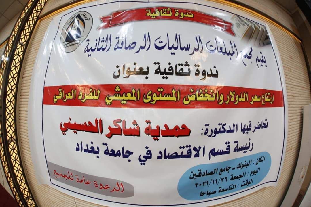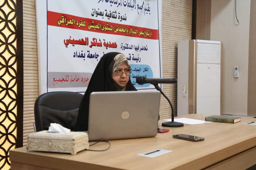 ناقش مجمع المبلغات الرساليات فرع البنوك، برعاية مكتب سماحة المرجع الديني الشيخ محمد اليعقوبي في بغداد/ الرصافة، أمس الأحد، خلال ندوة ثقافية، تغيير سعر صرف الدولار وتأثيره على ارتفاع نسبة الفقر في البلاد، حاضر فيها رئيس قسم الاقتصاد في جامعة بغداد حمدية شاكر الحسيني.