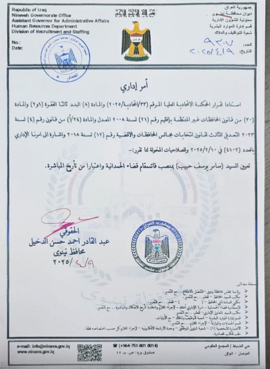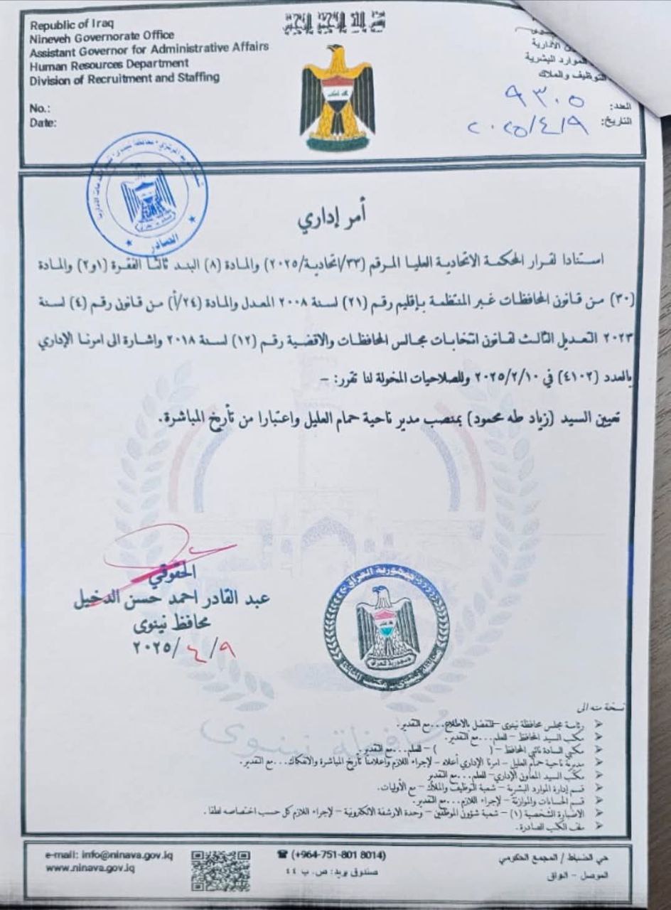 محافظ نينوى يصدر أوامر وجبة جديدة لرؤساء الوحدات الإدارية