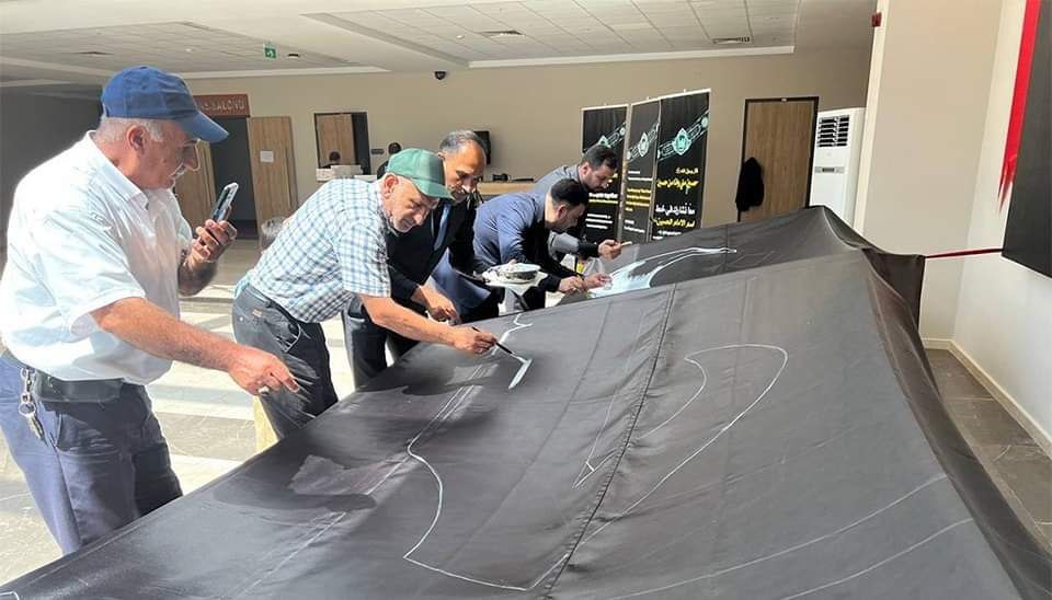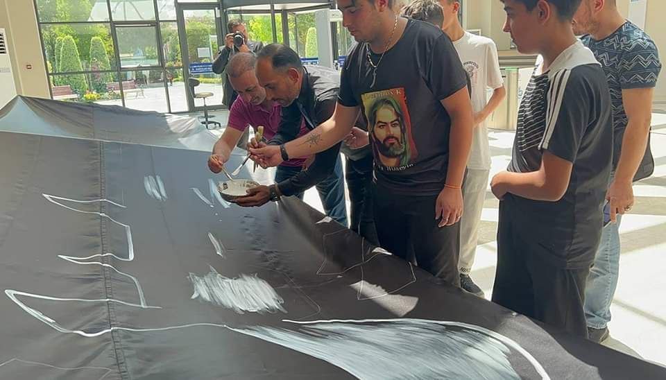 محبو أهل البيت (ع) في تركيا يشاركون بخط كلمة (يا حسين) على راية من مرقد الإمام الحسين (ع)