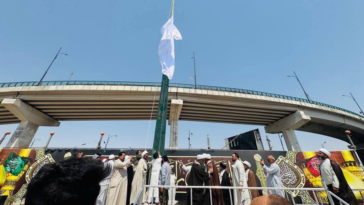 رفع مصلو جمعة الإمامين العسكريين (ع) في منطقة الجمعيات، راية نبي الرحمة على السارية المركزية وسط محافظة البصرة.