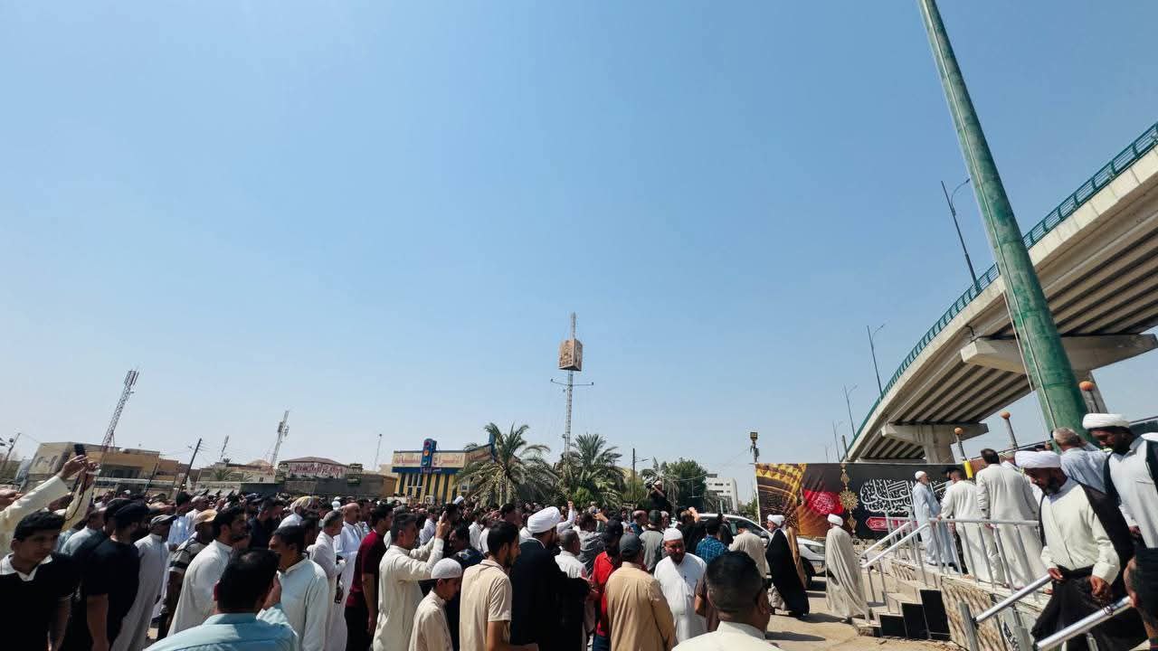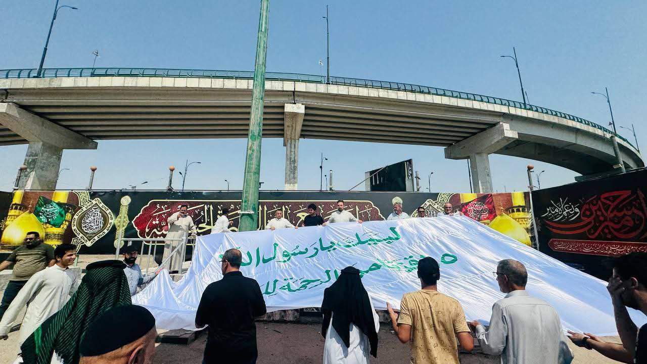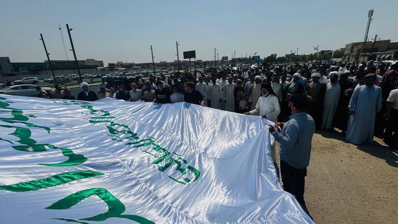 مصلو جمعة الإمامين العسكريين (ع) يرفعون راية نبي الرحمة على السارية المركزية وسط البصرة
