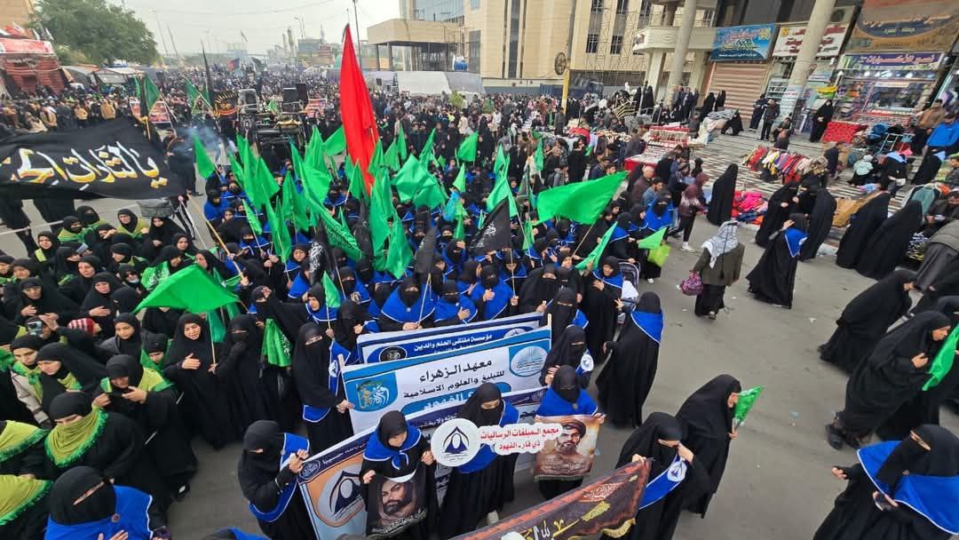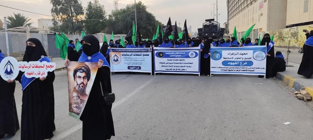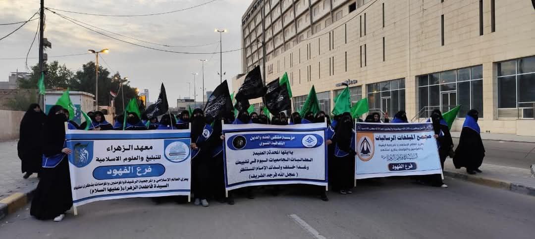 وذكر بيان للمعهد، تلقت “النعيم نيوز” نسخة منه، أنه “تحت شعار (ونراه قريباً)، شارك معهد الزهراء (ع) في قضاء الفهود شرقي محافظة ذي قار، في تشييع سيدتنا ومولاتنا السيدة فاطمة الزهراء (ع)، في الثالث من جمادى الآخرة، في النجف الأشرف حيث مرقد أمير المؤمنين (ع)”.