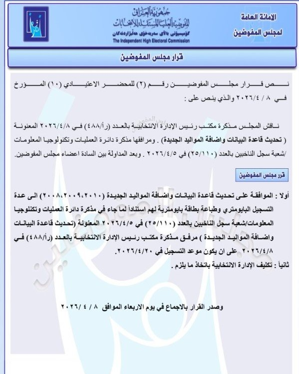 أعلنت مفوضية الانتخابات، اليوم الأحد، عن صدور قرار مجلس المفوضين رقم (2) للمحضر الاعتيادي (10) بتاريخ 8 نيسان/أبريل 2026، بالموافقة على تحديث قاعدة البيانات وإضافة المواليد الجديدة للأعوام (2008، 2009، 2010) إلى قاعدة التسجيل البايومتري، وطباعة بطاقة بيومترية لهم.