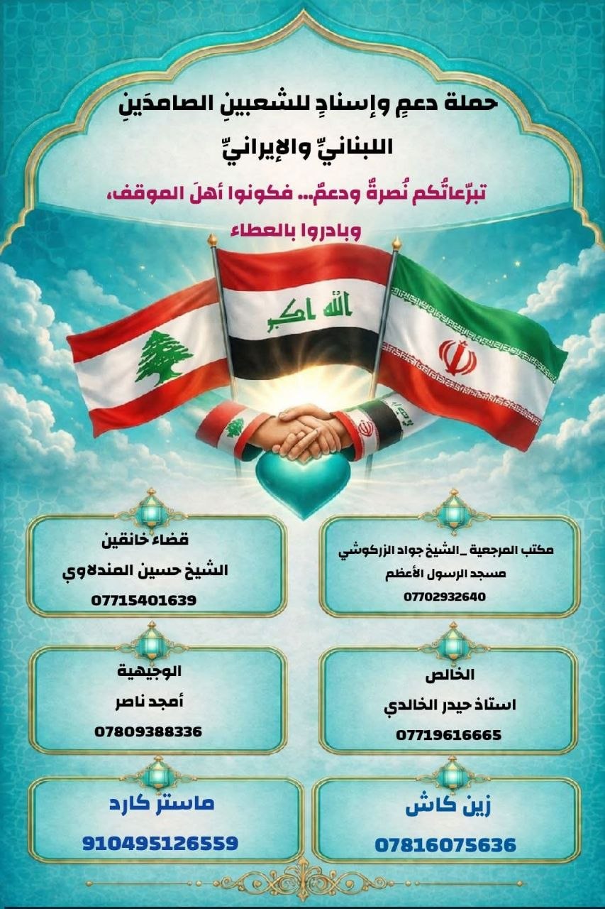 أقام مكتب سماحة المرجع الديني الشيخ محمد اليعقوبي في محافظة ديالى_مسجد الرسول الأعظم، حملة الدعم والإسناد للجمهورية الإسلامية والشعب اللبناني.