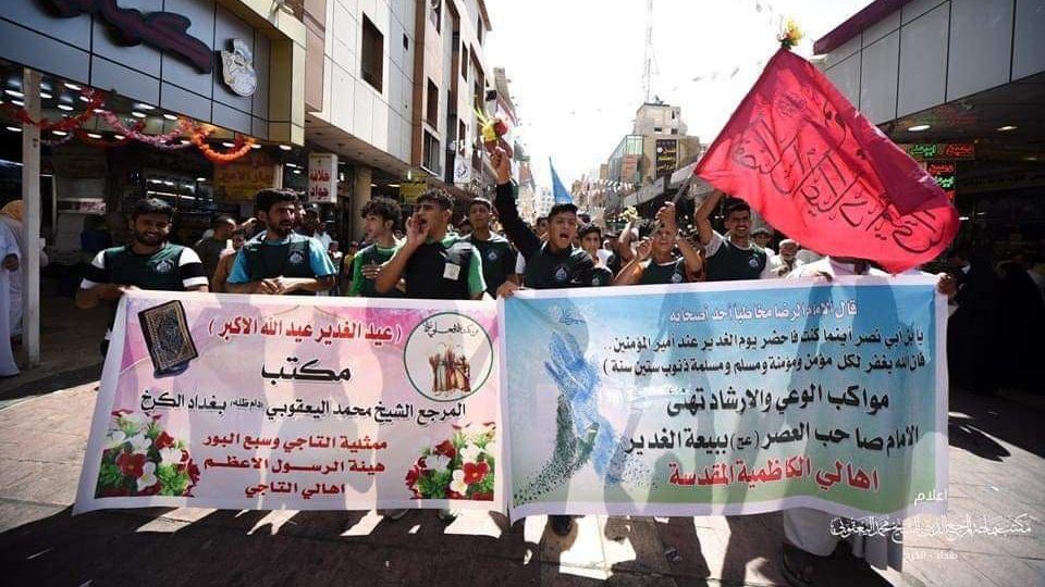 وذكر بيان لمكتب المرجعية، تلقت “النعيم نيوز” نسخة منه، أنه “استجابة لدعوى سماحة المرجع الديني الشيخ محمد اليعقوبي، لإحياء عيد يوم الغدير المبارك، نظم مكتبُ سماحة المرجع الديني الشيخ محمد اليعقوبي في بغداد، مسيرة كبيرة في النجف الأشرف، لتجديد العهد والولاء مع إمام المتقين علي بن أبي طالب (عليه السلام) في يوم الغدير الأغر“.